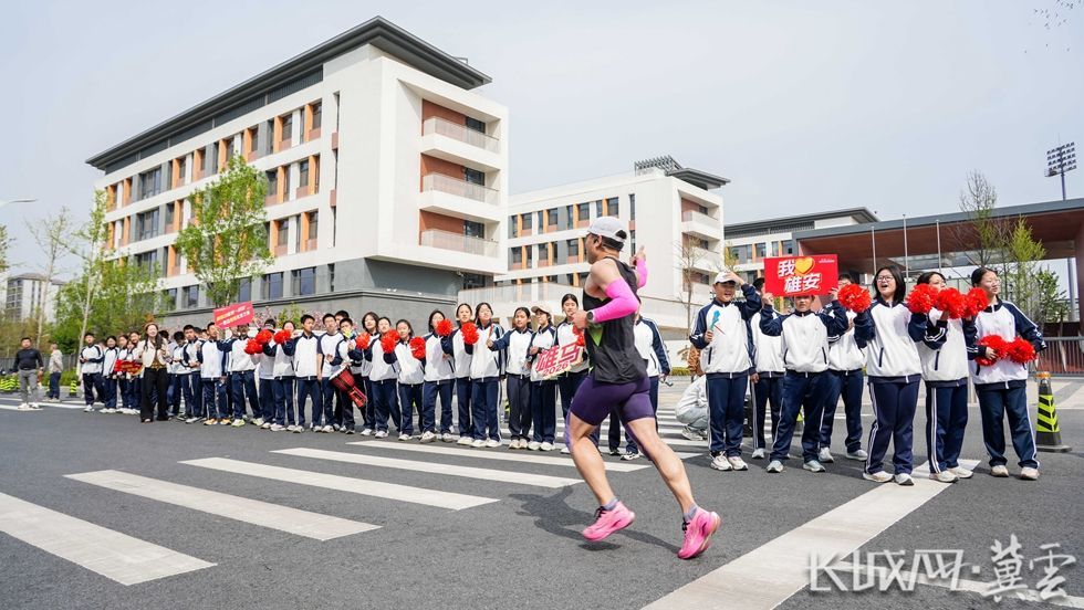 北京四中雄安校区的师生为跑过的选手加油。李征 摄