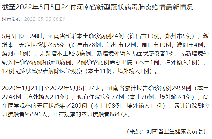 5月5日0—24时,河南省新增本土确诊病例24例(许昌市19例,郑州市5例),新增本土无症状感染者55例(许昌市28例,郑州市12例,周口市10例,濮阳市4例,漯河市1例),无新增本土疑似病例。新增境外输入无症状感染者1例,无新增境外输入性确诊病例和疑似病例。2例确诊病例治愈出院(本土1例,境外输入1例),12例无症状感染者解除医学观察(本土11例,境外输入1例)。