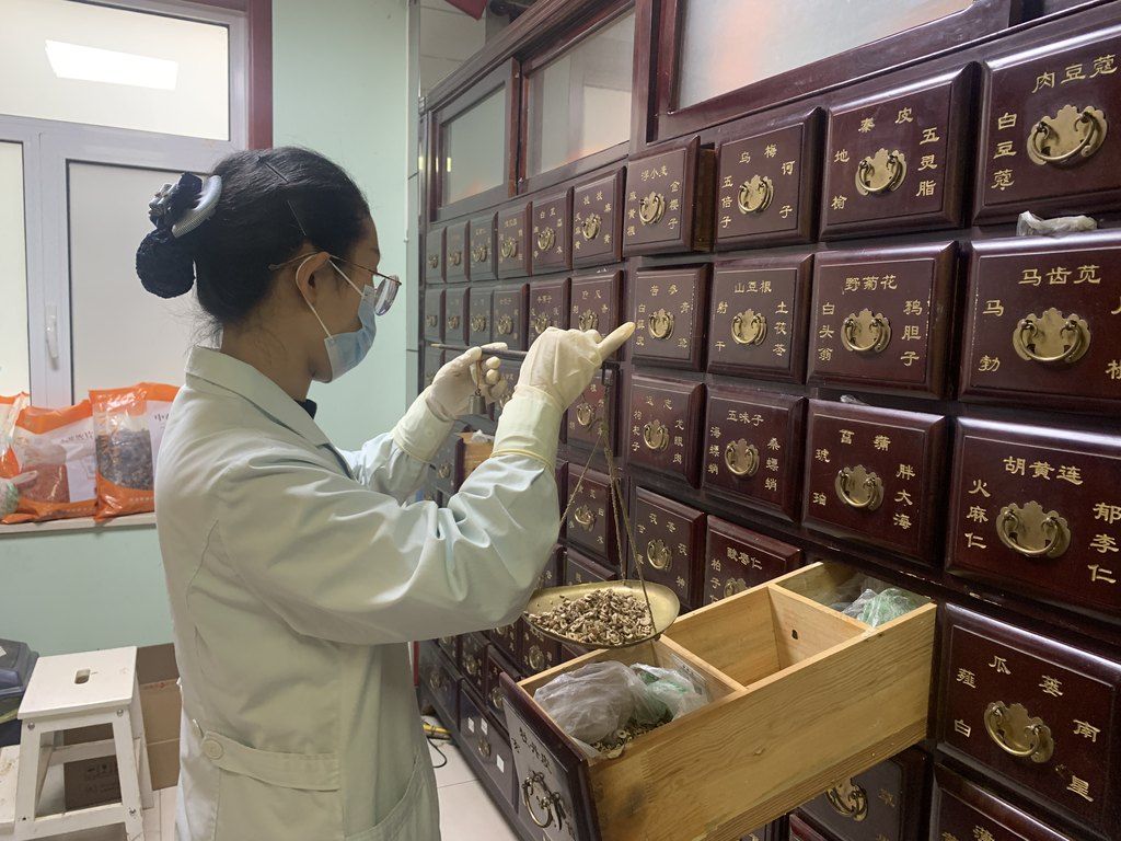 石家庄市桃园社区卫生服务中心国医堂工作人员在中药房给患者抓药。