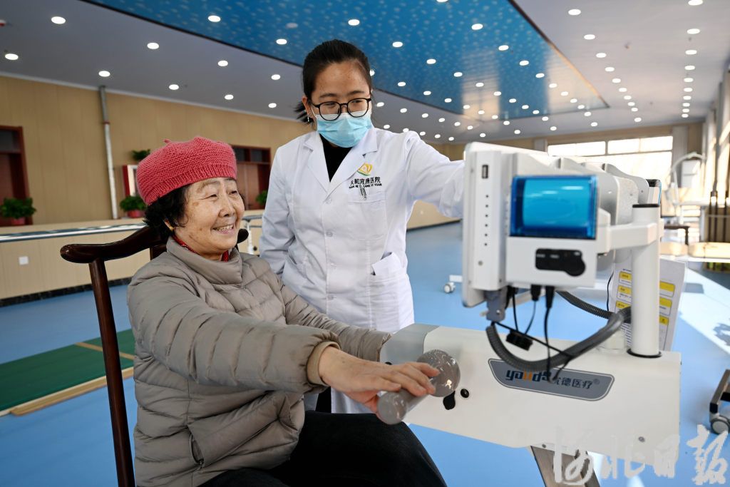 来自北京的张秀婷(左)在保定涞水县天和宜居康复中心体验康复治疗器械。