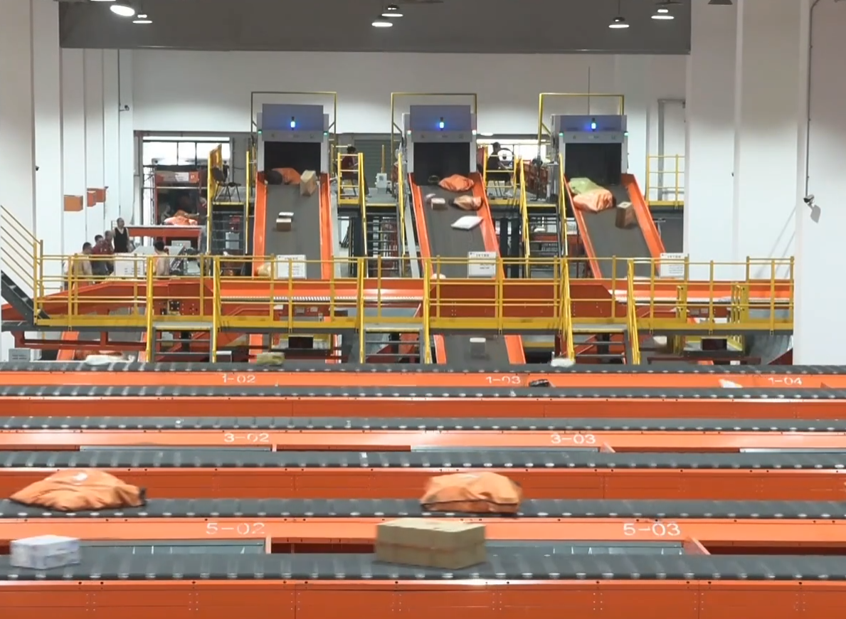 廊坊永清县圆通速递北方总部基地二期项目的快递分拣车间,30条全自动分拣线高速运转。