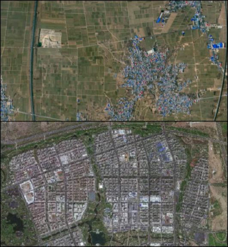 拼版照片:2021年8月,航拍镜头下的河北省容城县小里镇胜利庄村(上图);2024年6月,航拍镜头下的雄安新区容东片区街道(下图)。