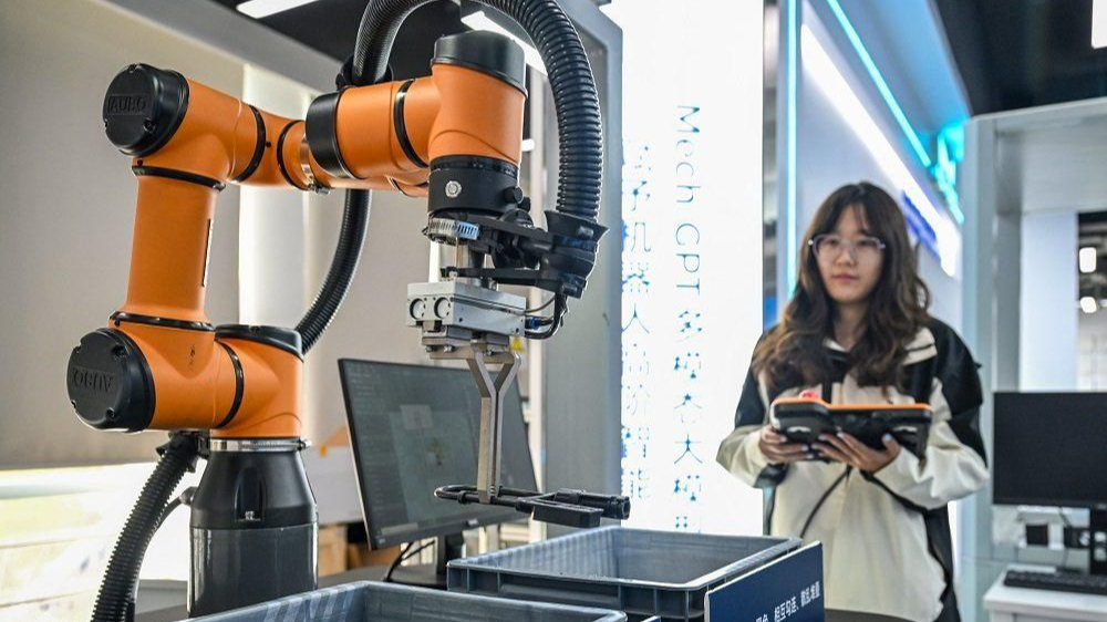 雄安新区中关村科技园内,一企业员工正在操控工业机器人。(图片来源:河北日报)