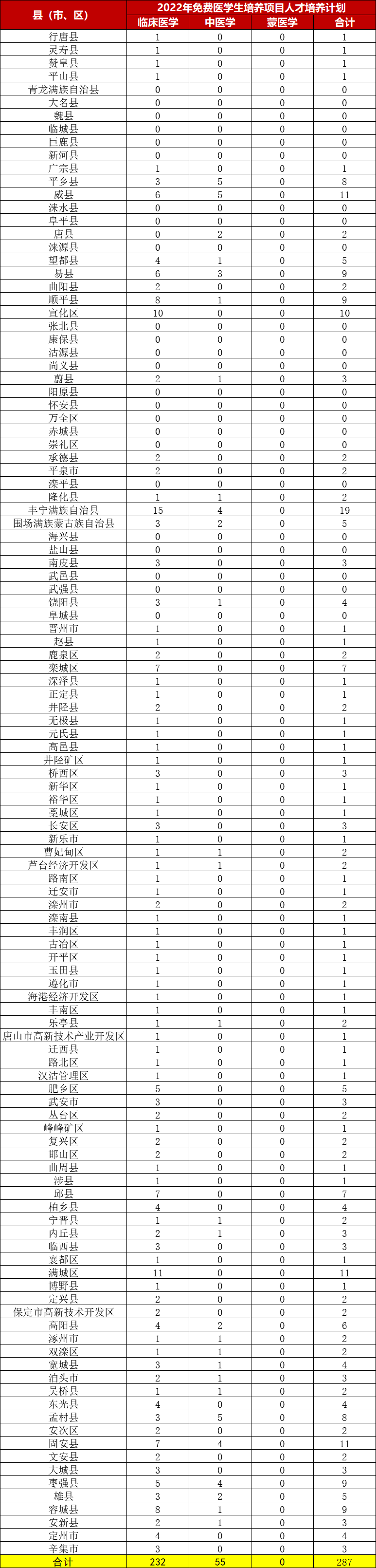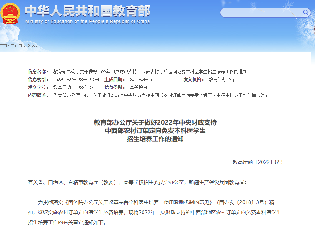 最新消息!教育部办公厅刚刚发布关于做好2022年中央财政支持中西部农村订单定向免费本科医学生招生培养工作的通知。今年计划在河北招生287人,免费上大学,毕业有工作。如何报名,报名有哪些条件,一起了解一下↓↓