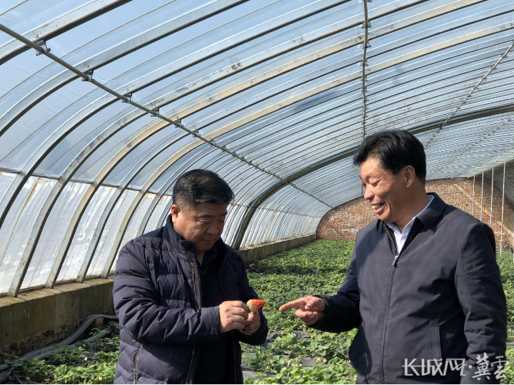 石家庄市农广校专家与农户一起交流草莓种植经验。