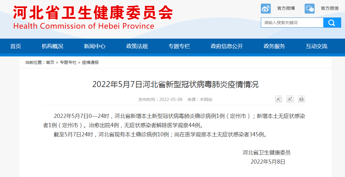 2022年5月7日0—24时,河北省新增本土新型冠状病毒肺炎确诊病例1例(定州市);新增本土无症状感染者1例(定州市)。治愈出院4例,无症状感染者解除医学观察44例。