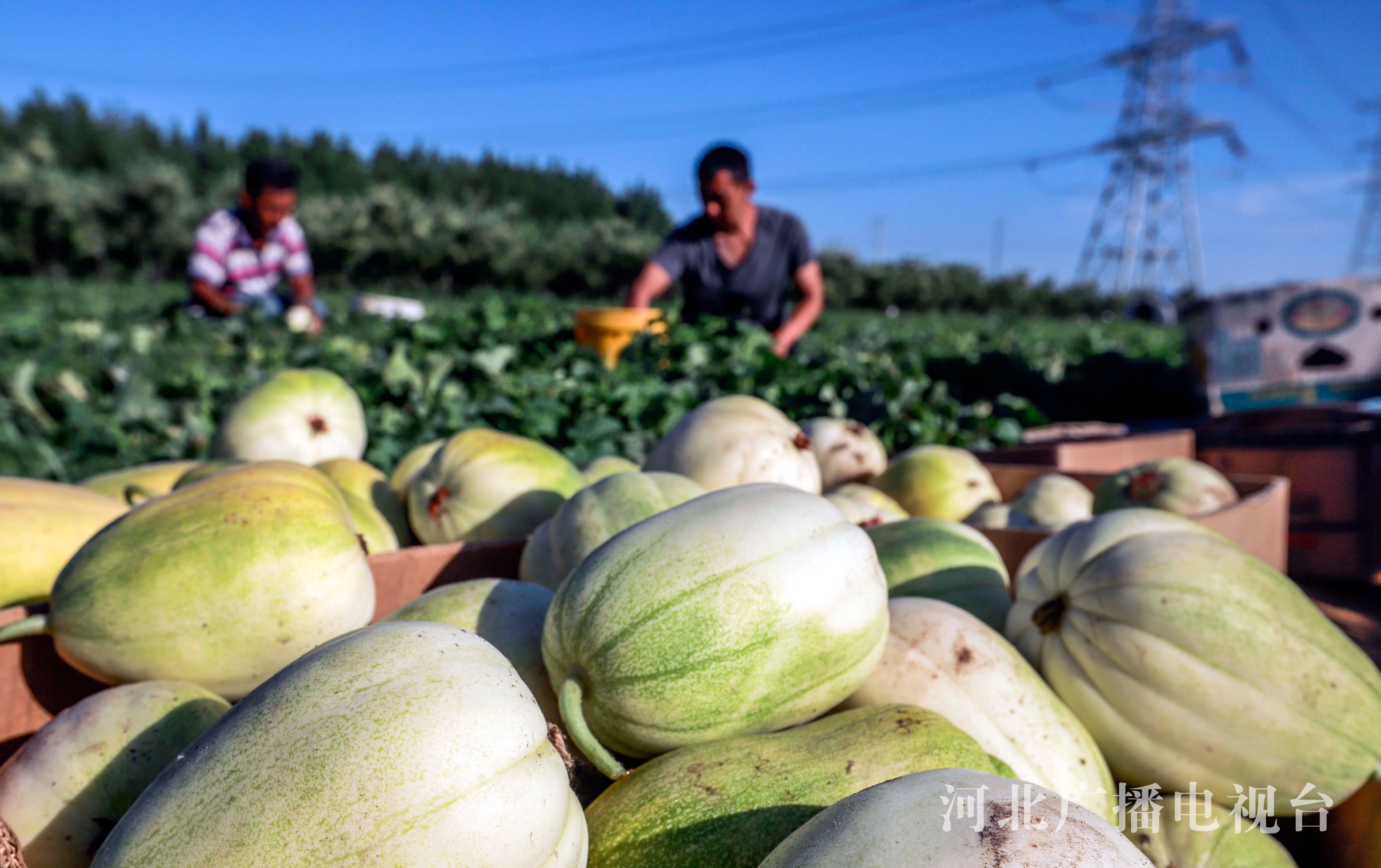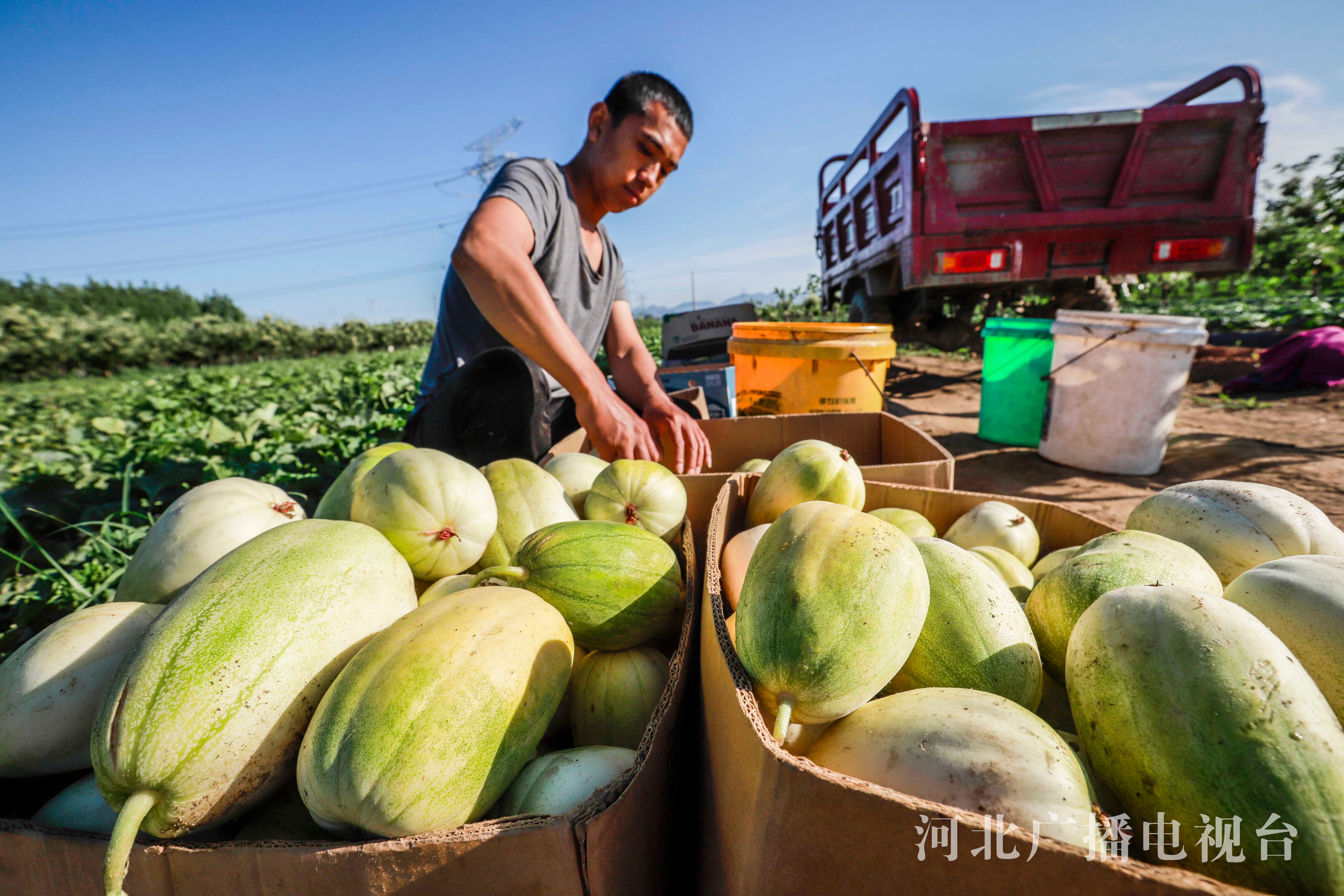 仲夏时节,唐山遵化石门镇的沙地瓜田一片忙碌景象,农民抢抓农时收获甜瓜,装箱外运销售。