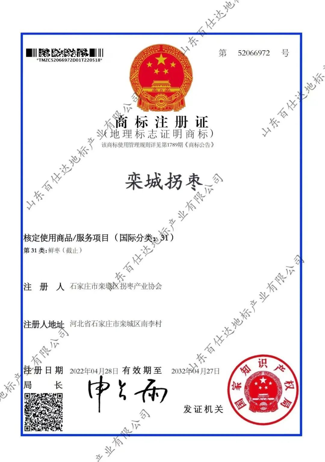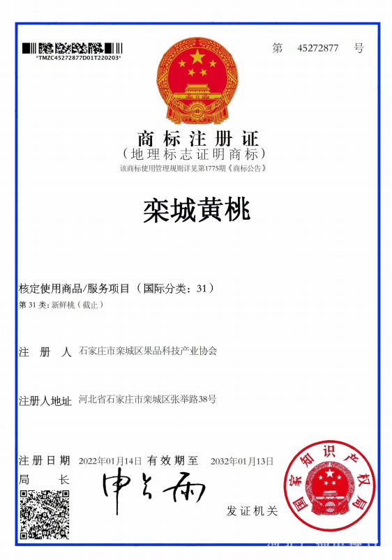冀时客户端报道(河北台 杜岩卿 王岩 通讯员 董辉)近日,石家庄市栾城区新添3件国家地理标志证明商标“栾城葡萄”“栾城黄桃”“栾城拐枣”。至此,栾城区地理标志证明商标数量达到了7件,其余4件为栾城草莓、栾城仙客来、栾城黑土豆、栾城无花果。