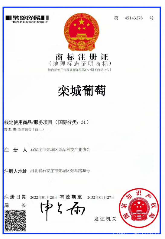 栾城葡萄富含有机质,栾城葡萄果粒大,果皮润滑光亮,果肉甘甜鲜美,深受消费者的喜爱。2022年,由石家庄市栾城区果品科技产业协会申报的“栾城黄桃”“栾城葡萄”先后被国家知识产权局核准认定为地理标志证明商标成功。据了解,该协会还制定出了相关的团体标准文件,不仅优化了水果加工链条的供给结构,提高了农产品质量,而且提高了栾城区相关果品知名度,促进了本地农业经济的发展。