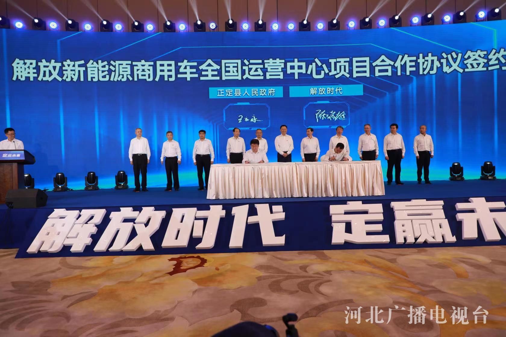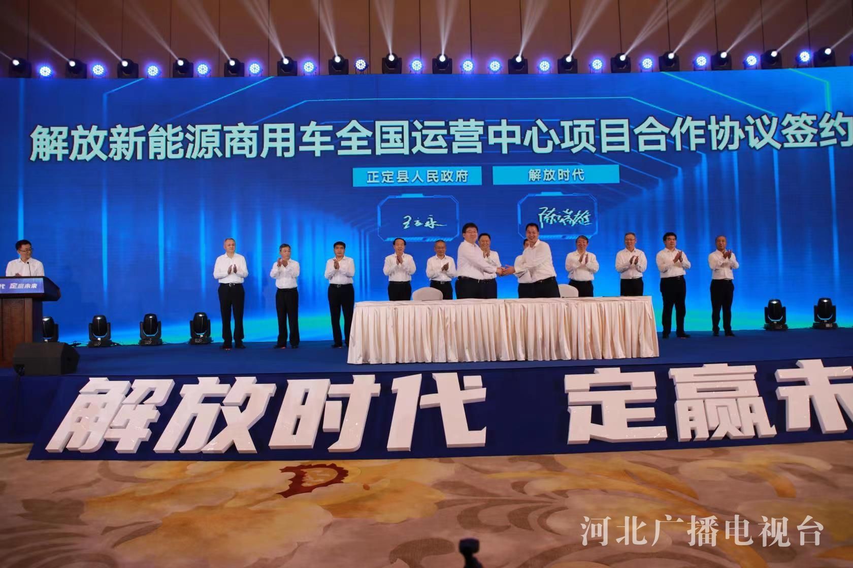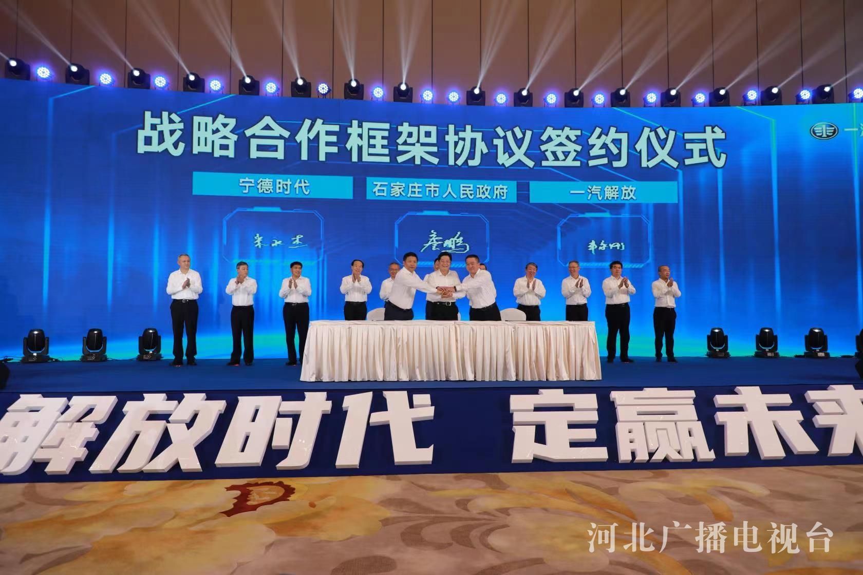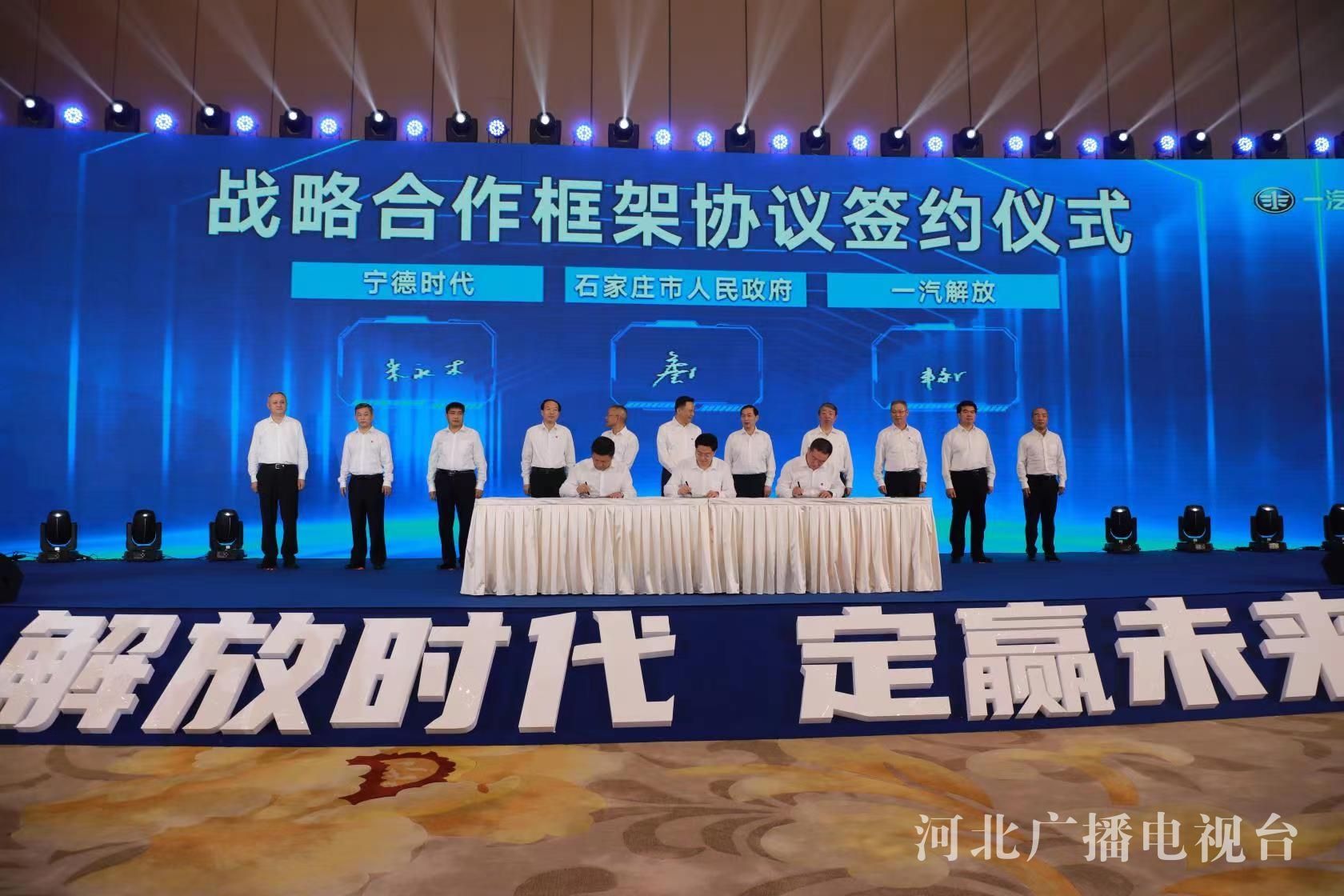 签约仪式上,石家庄市政府与一汽解放汽车有限公司、宁德时代新能源科技股份有限公司签署《战略合作框架协议》,正定县政府与“解放时代”签署《解放新能源商用车全国运营中心项目合作协议》,石家庄市交投集团、石家庄市城发投集团与一汽解放、中国石油天然气河北销售分公司签署《战略合作框架协议》,解放赋界(天津)科技产业有限公司与河北盛航新能源专用汽车有限公司签署《解放(石家庄)专用车基地项目合作协议》。