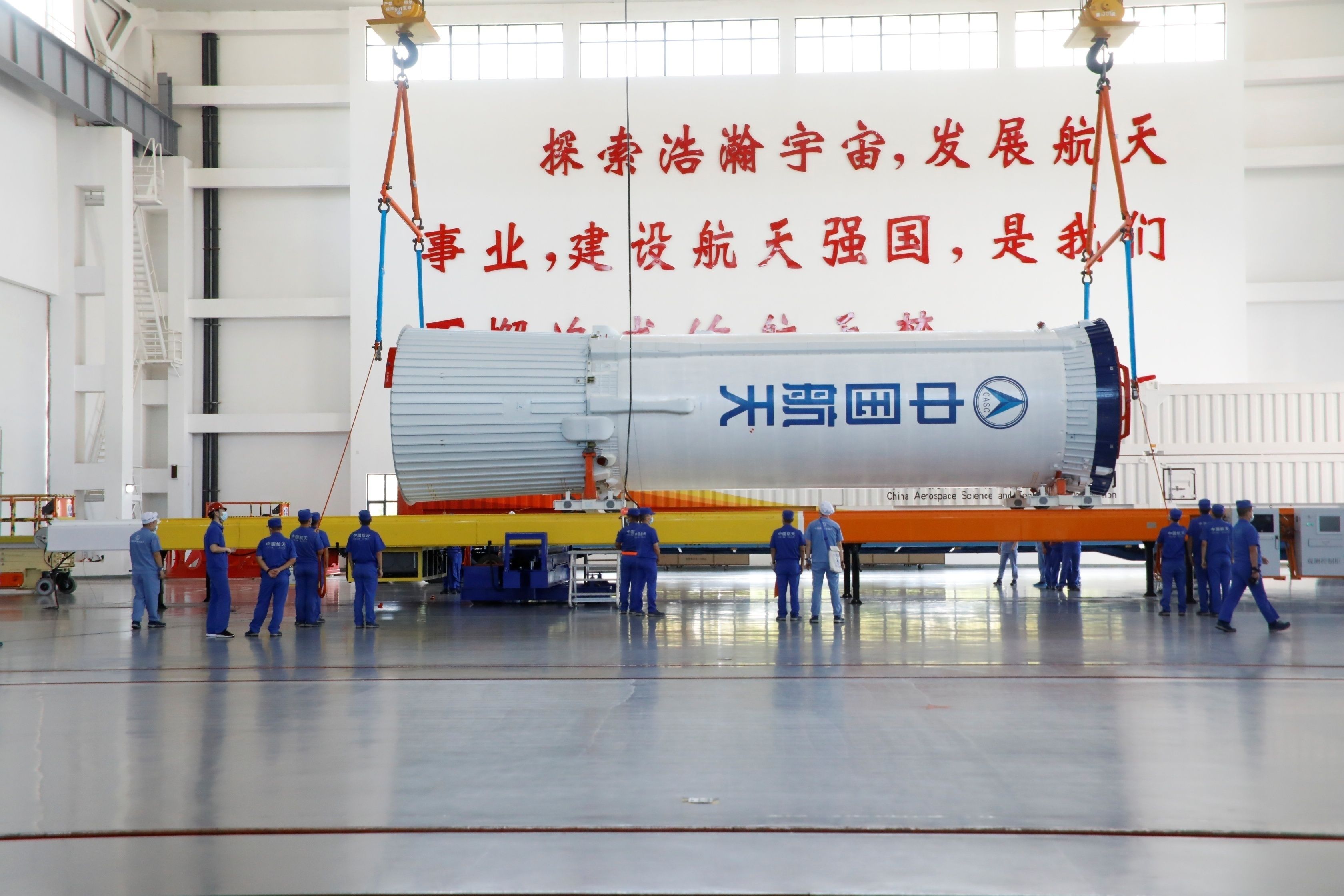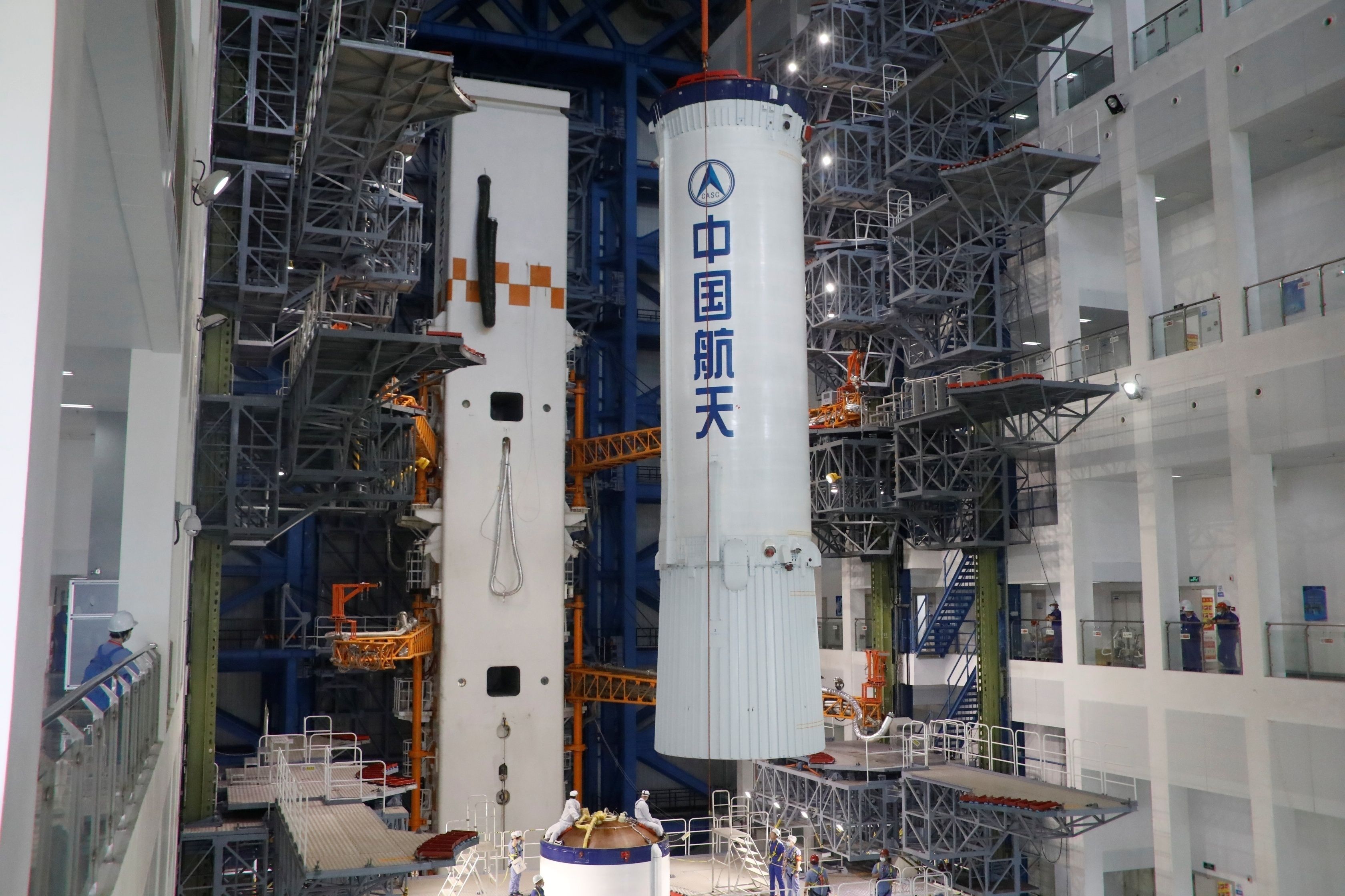 魏远明介绍,作为全低温火箭,长七改火箭也是目前我国模块数量最多的新一代火箭,由4个助推器、芯一级、芯二级和芯三级构成,部段较多且复杂。以前,需等所有部段都准备齐备,再一鼓作气完成垂直总装。这次任务中,团队将总装模式由“一气呵成”改为“随到随吊”,优化总装时间。