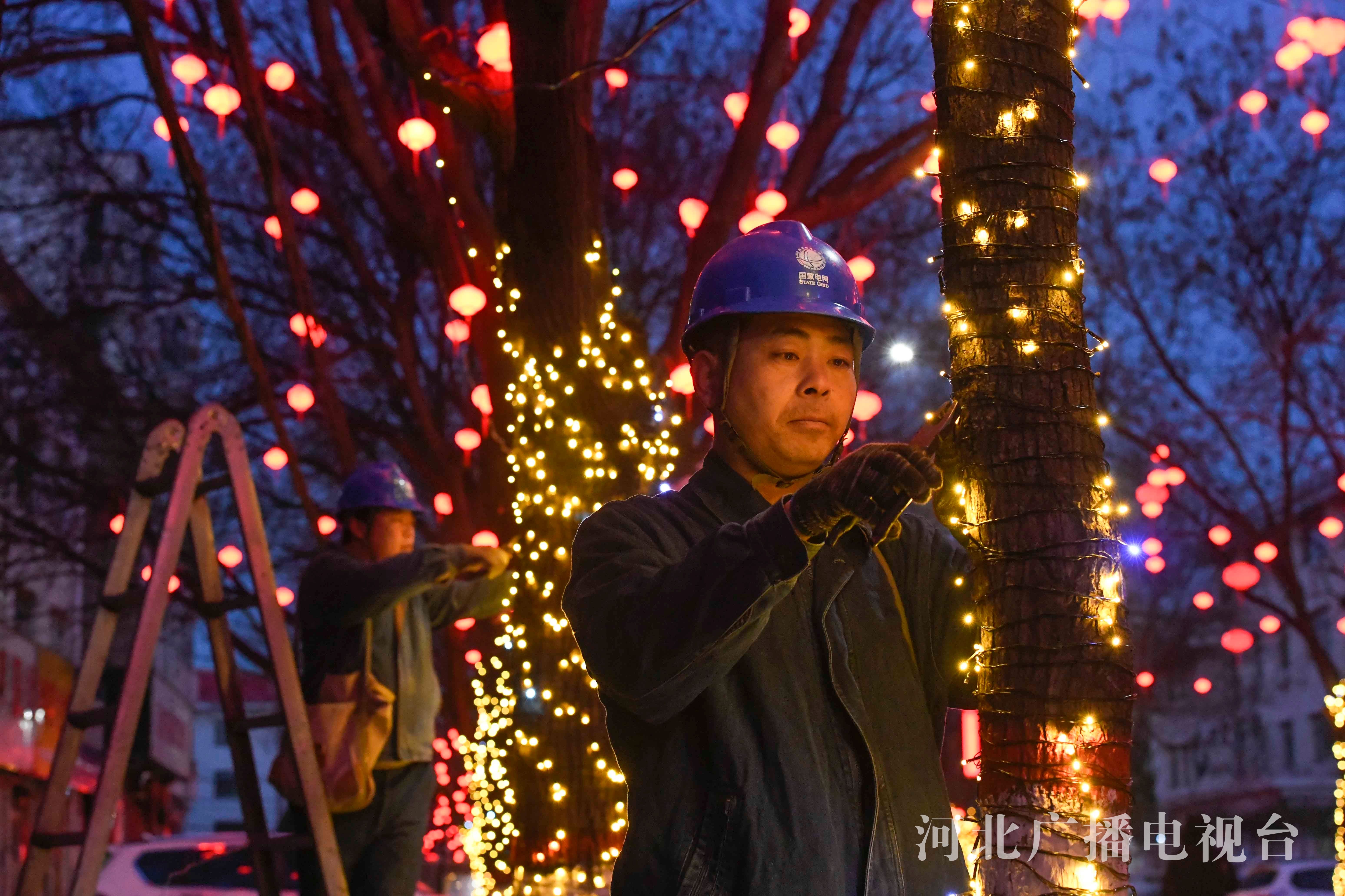 1月21清晨,工作人员在河北省迁西县城区检查整理树木上悬挂的灯笼。