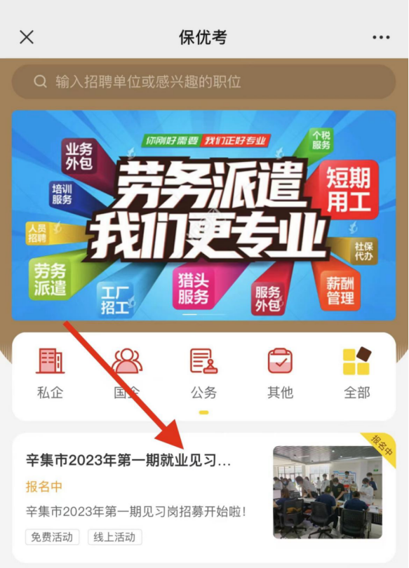 (1)报名方法:关注“保优考”公众号,点击“政企招聘”,选择“辛集市2023年第一期就业见习岗招募”如实填写个人信息。