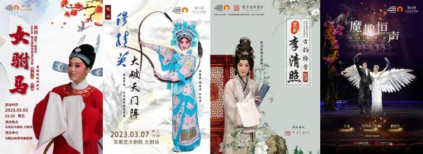 戏曲板块— 南腔北调戏曲节。3 月 2 日-3 日, 由 白玉兰奖、著名 黄梅戏表演艺术家吴琼领衔主演的经典黄梅戏《天仙配》《女驸马》, 丝丝入扣的表演,优雅悦耳的唱腔,引得现场掌声雷动,经久不息, 为近两千名观众献上了一场回味无穷的黄梅戏盛宴,引爆石门。正式 拉开了石家庄大剧院 2023 春日演出季的帷幕。