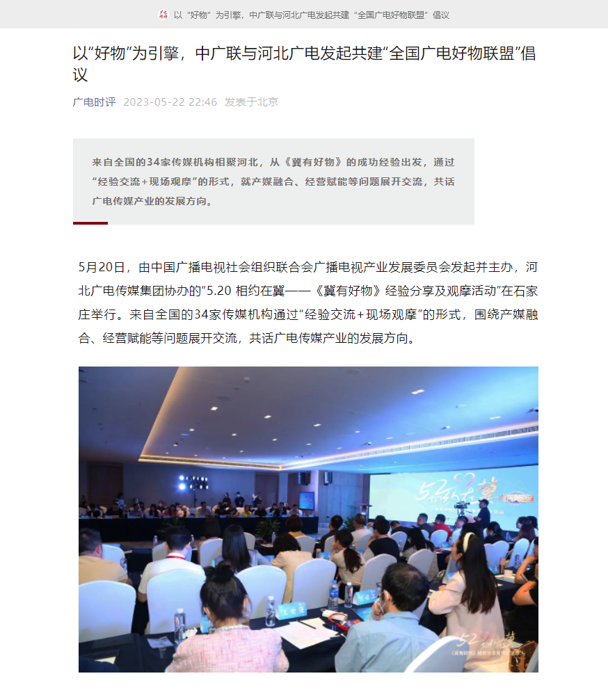 5月22日,国家广播电视总局《广电时评》发文《以“好物”为引擎,中广联与河北广电发起共建“全国广电好物联盟”倡议》,称来自全国的34家传媒机构相聚河北,从《冀有好物》的成功经验出发,通过“经验交流+现场观摩”的形式,就产媒融合、经营赋能等问题展开交流,共话广电传媒产业的发展方向。