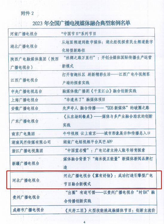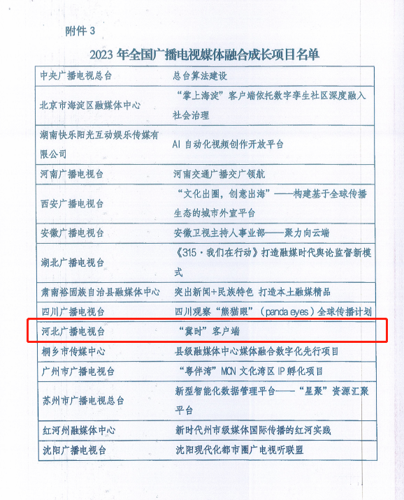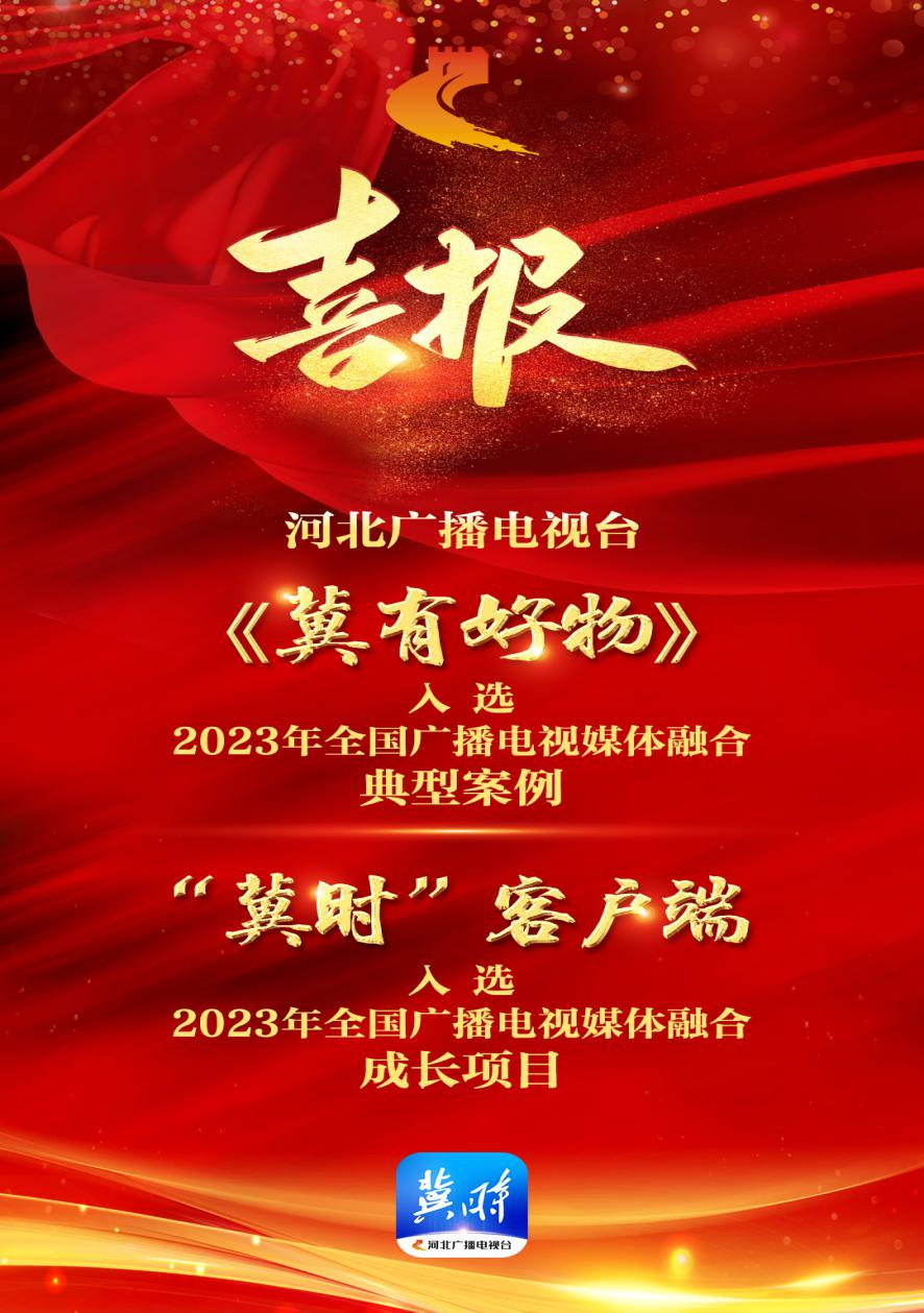 近日,国家广播电视总局办公厅发布《关于公示2023年全国广播电视媒体融合先导单位、典型案例、成长项目征集推选结果的通知》,河北广播电视台《冀有好物:成功打造引擎型广电节目融合新模式》入选典型案例、“冀时”客户端入选成长项目。