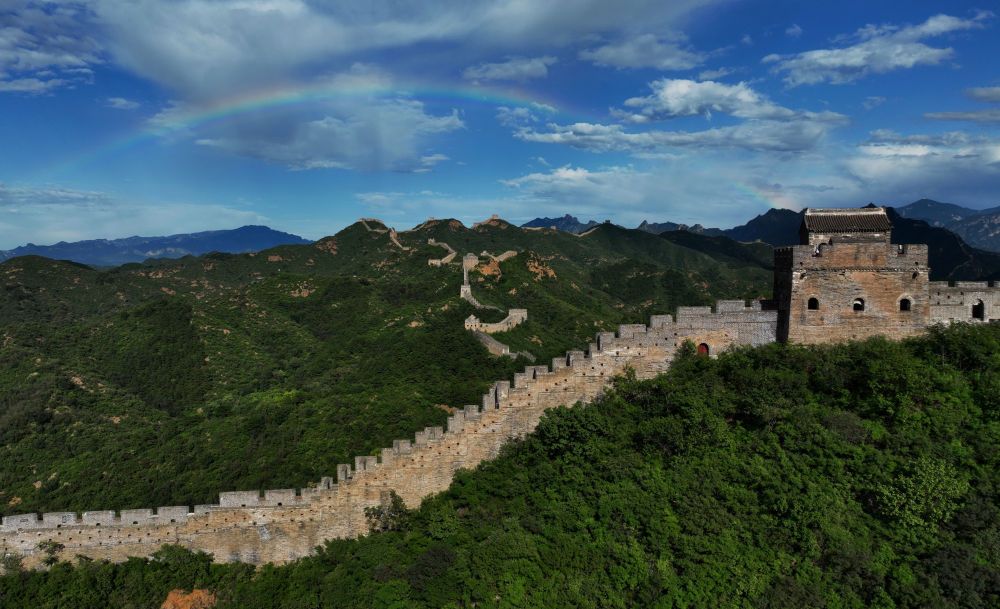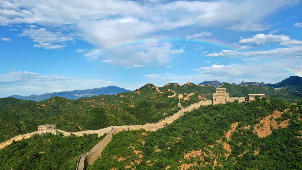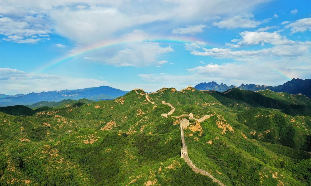 ↑一场雷阵雨过后,金山岭长城出现彩虹景观(8月31日摄,无人机照片)。新华社记者 陈斌 摄