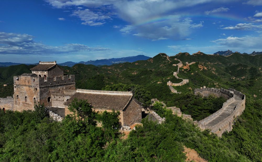 ↑金山岭长城与彩虹交相辉映(8月31日摄,无人机照片)。新华社记者 牟宇 摄
