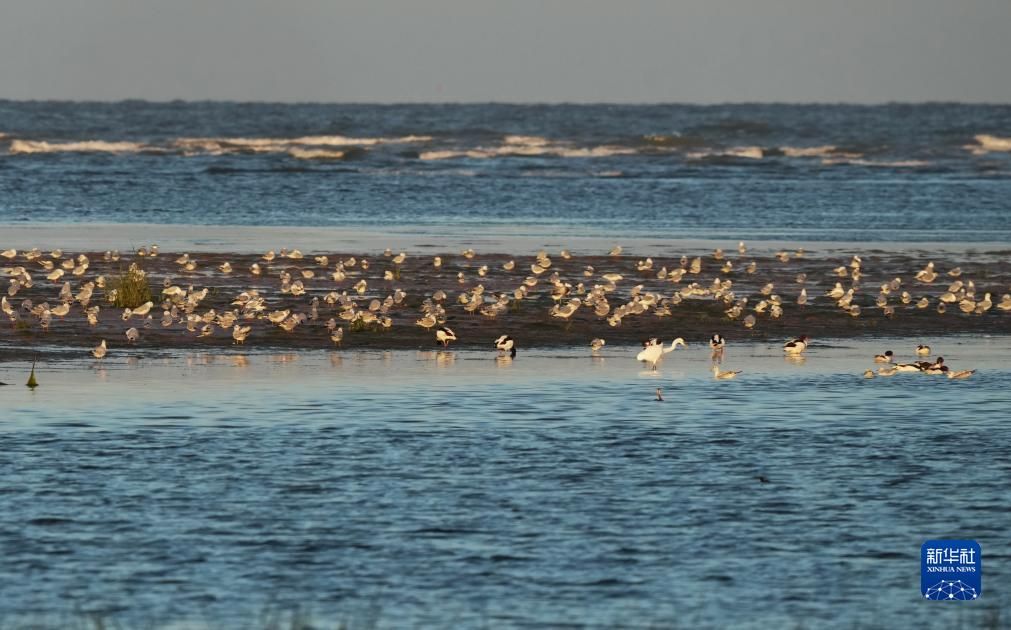 9月23日,一群水鸟在河北省秦皇岛市北戴河区沿海湿地觅食。