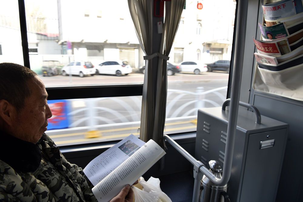 ↑11月28日,在文安县城区一辆公交车上,一名乘客在阅读图书。