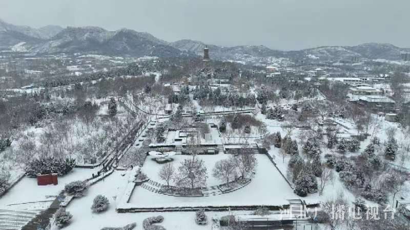 飘雪洒落在塔檐,层层叠叠、神韵悠悠。古塔与园林中的亭台楼榭浑然一色、静谧悠然。置身其中,仿佛进入了白色的童话世界,目之所及,美如诗画。