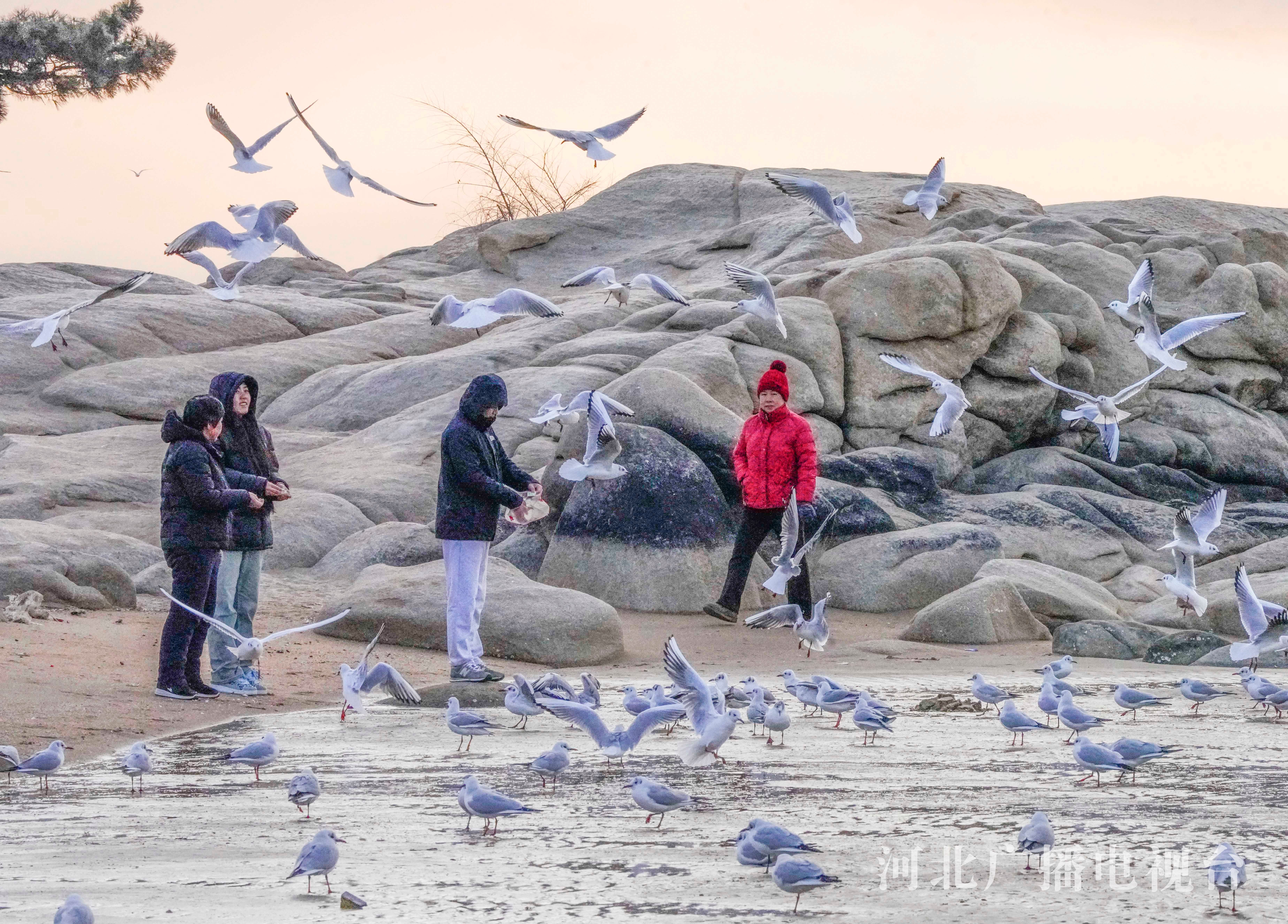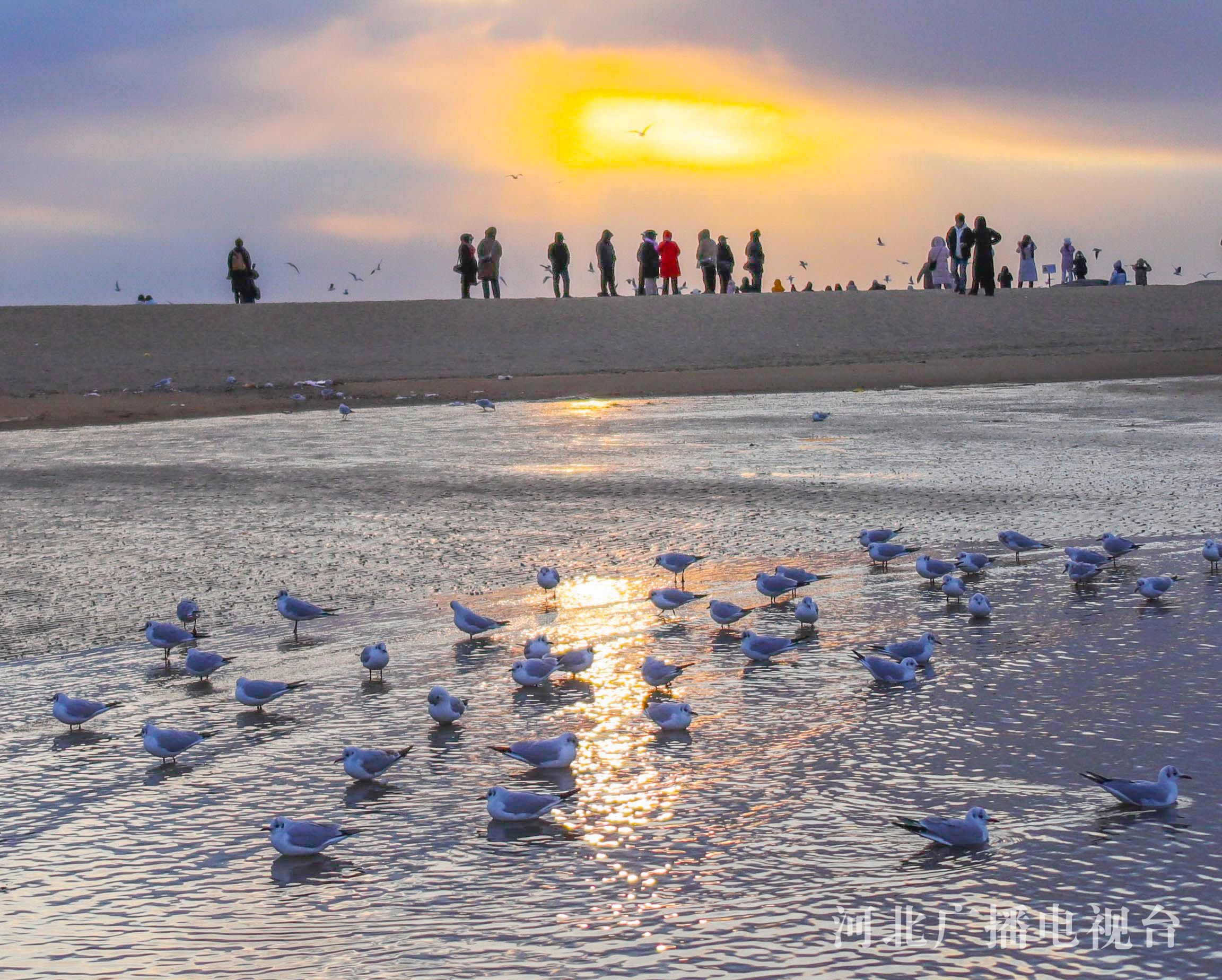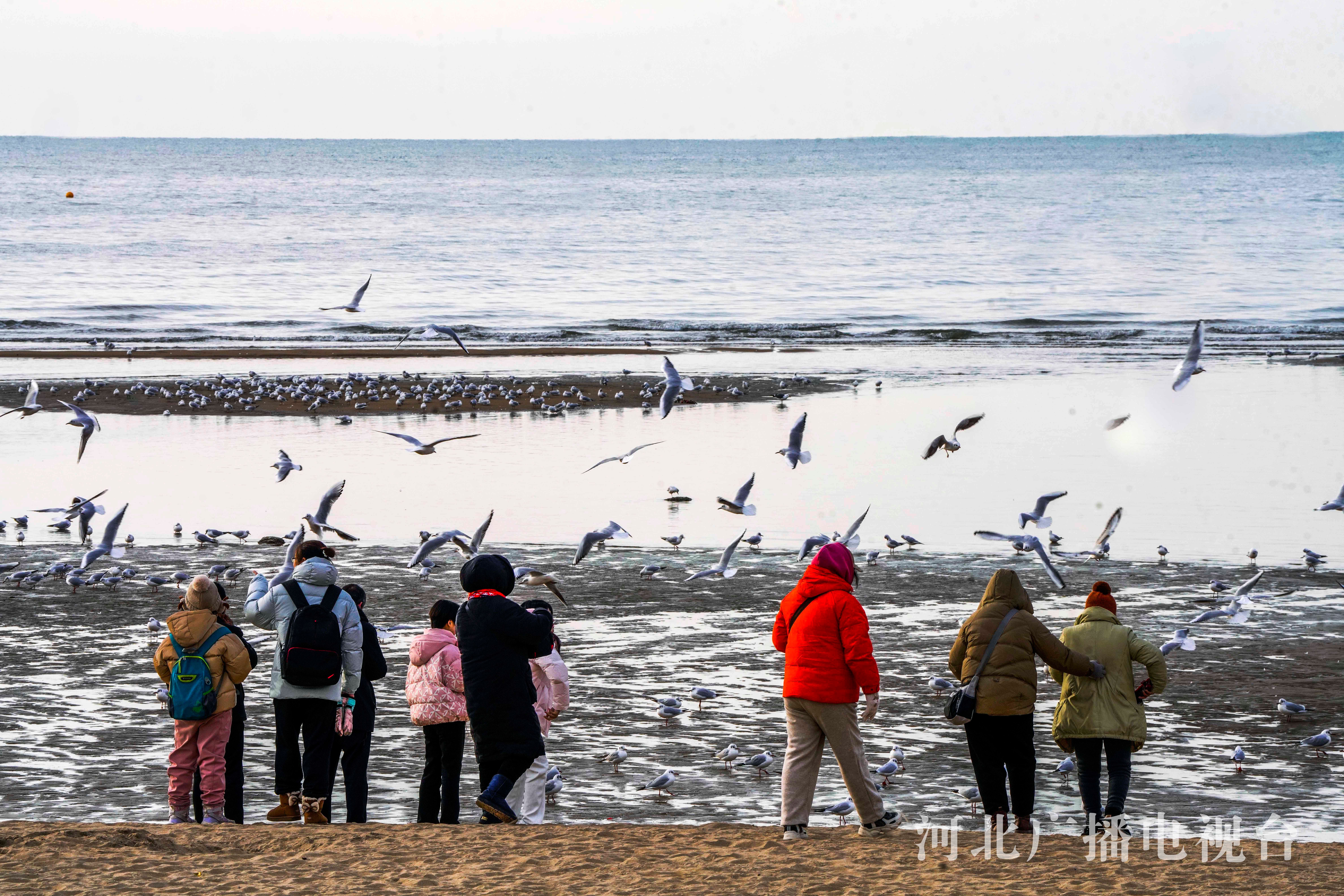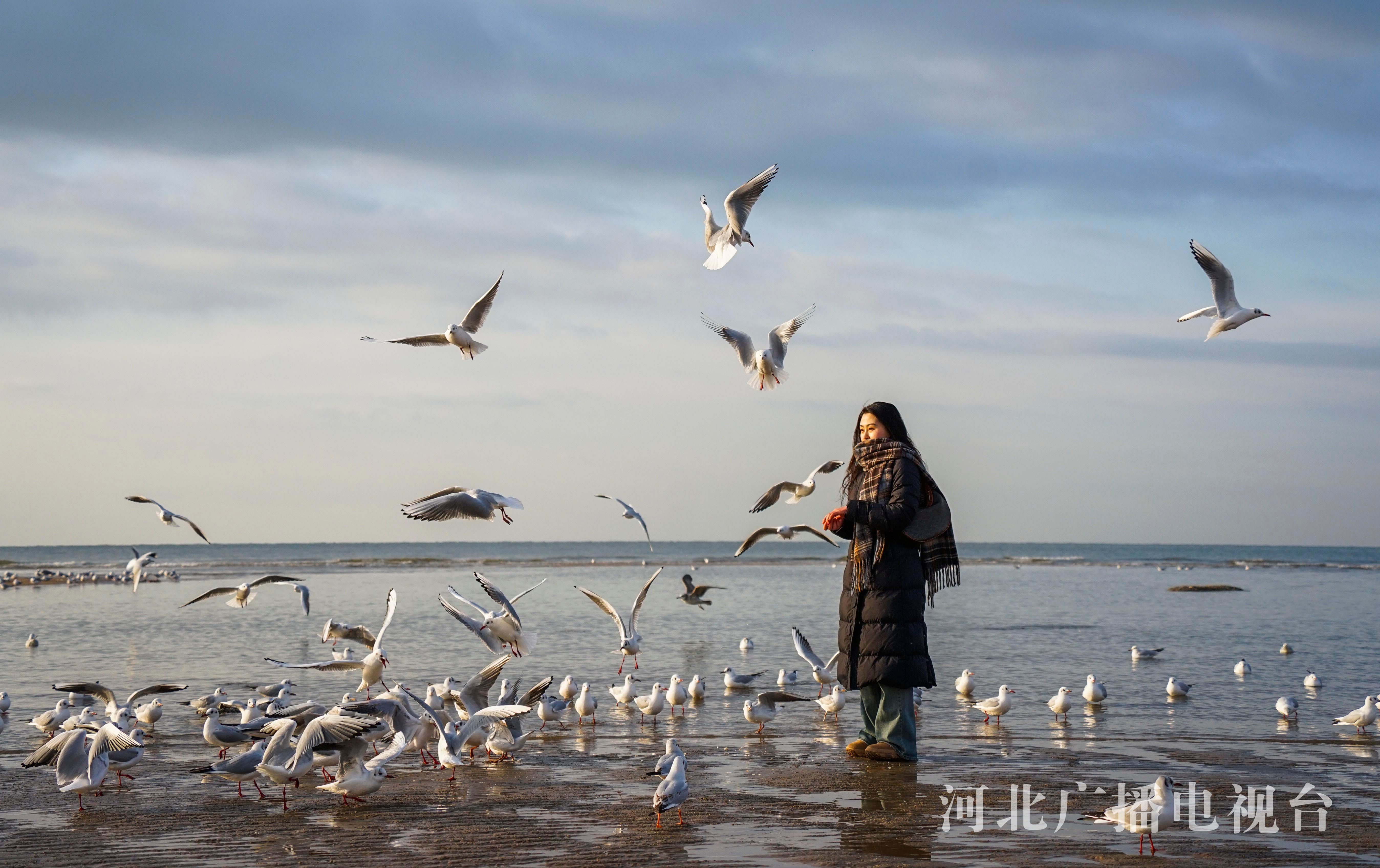 冀时客户端报道(通讯员 刘满仓)2月21日,游客在秦皇岛市北戴河老虎石海滩公园观看海鸥。早春时节的清晨,在秦皇岛市北戴河老虎石海滩公园,成群的海鸥飞舞、戏水,游客络绎不绝。
