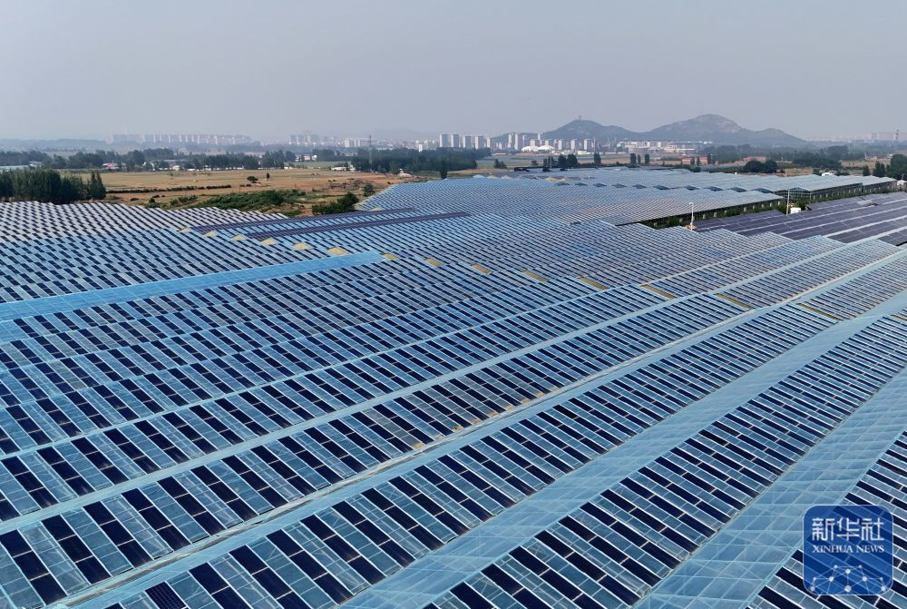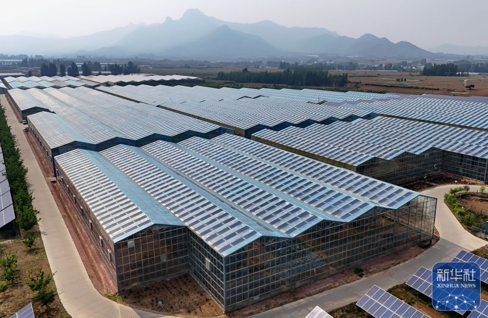 ↑ 5月29日拍摄的秦皇岛市抚宁区坟坨镇20兆瓦“农光互补”光伏发电场的智能光伏温室(无人机照片)。