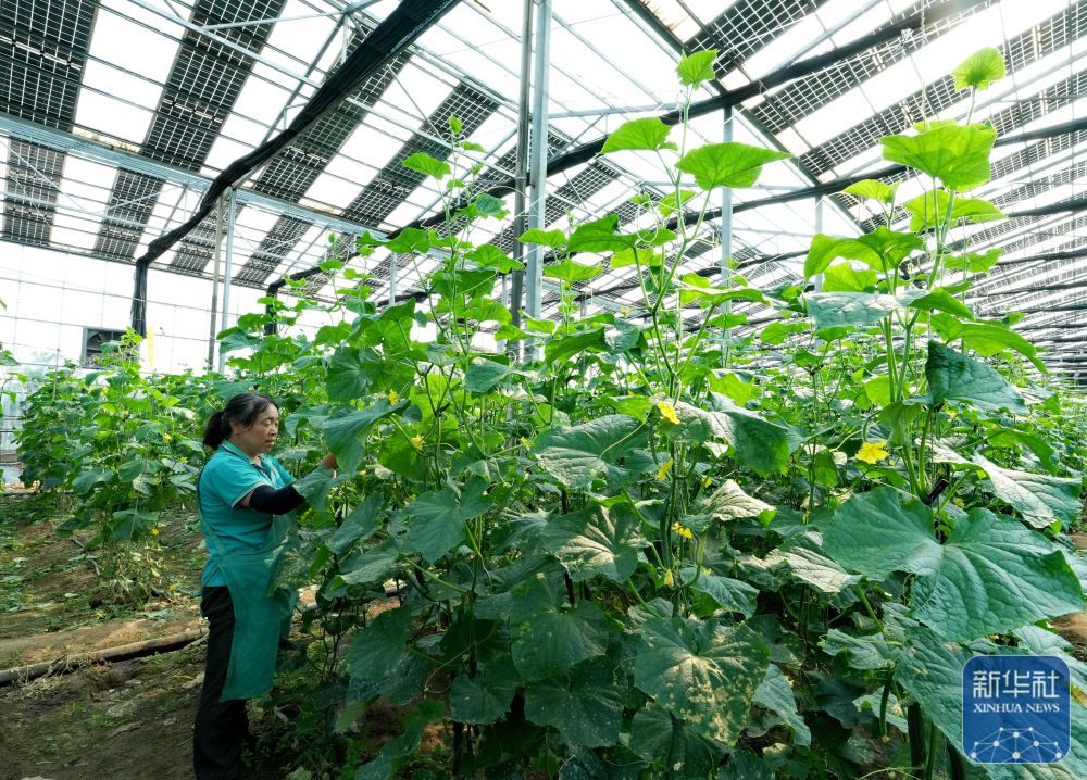 ↑ 5月29日,农民在秦皇岛市抚宁区坟坨镇20兆瓦“农光互补”项目的智能光伏温室内管护黄瓜。