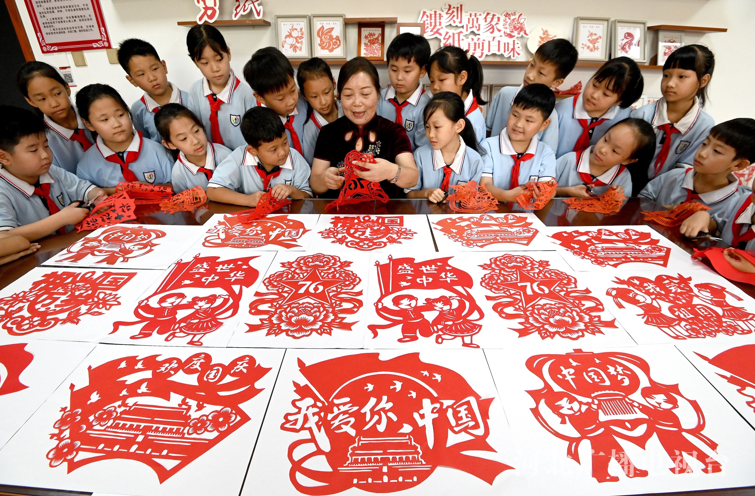9月28日,河北省邯郸市复兴区铁路小学的老师指导学生创作国庆主题剪纸作品。
