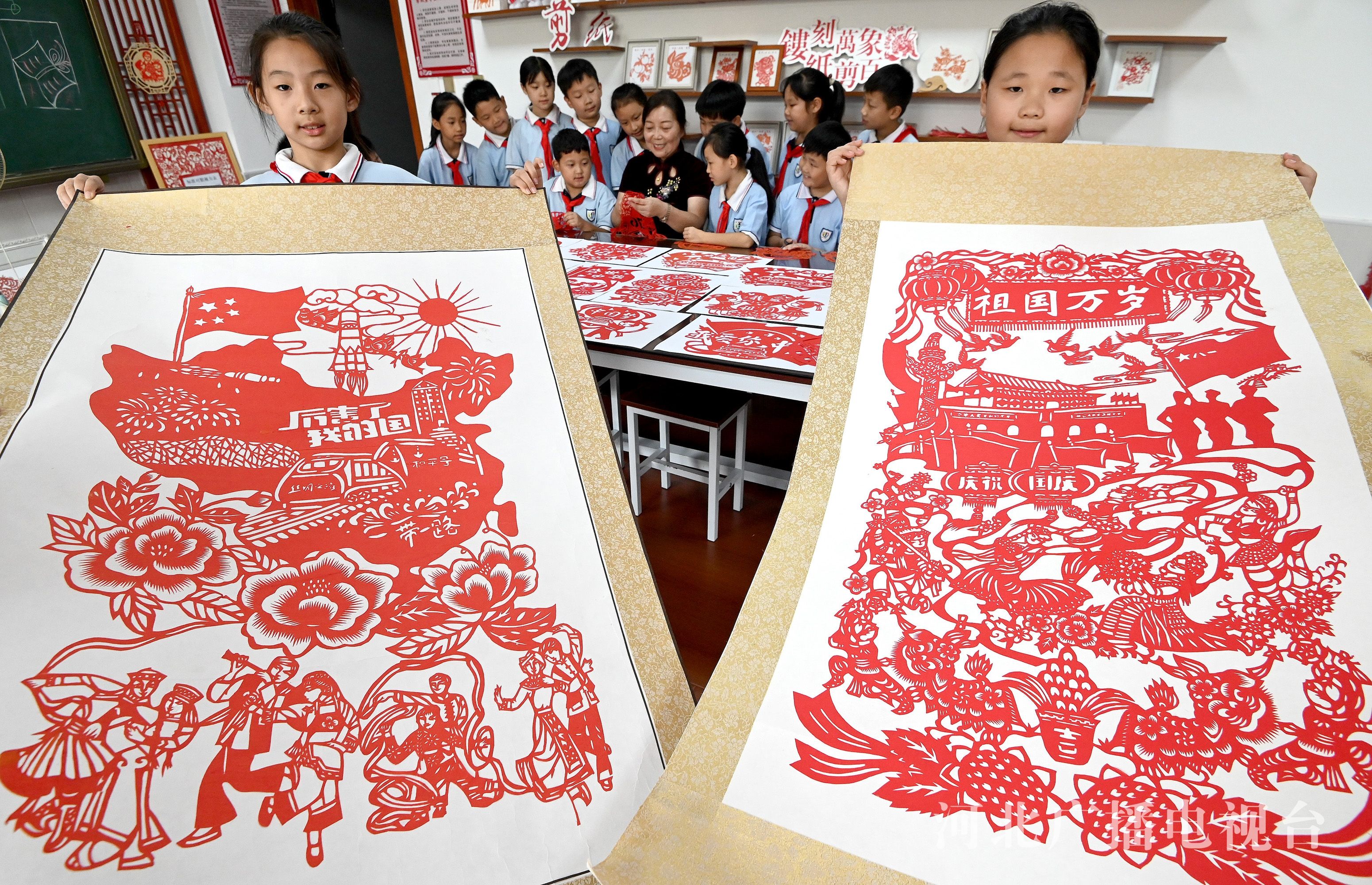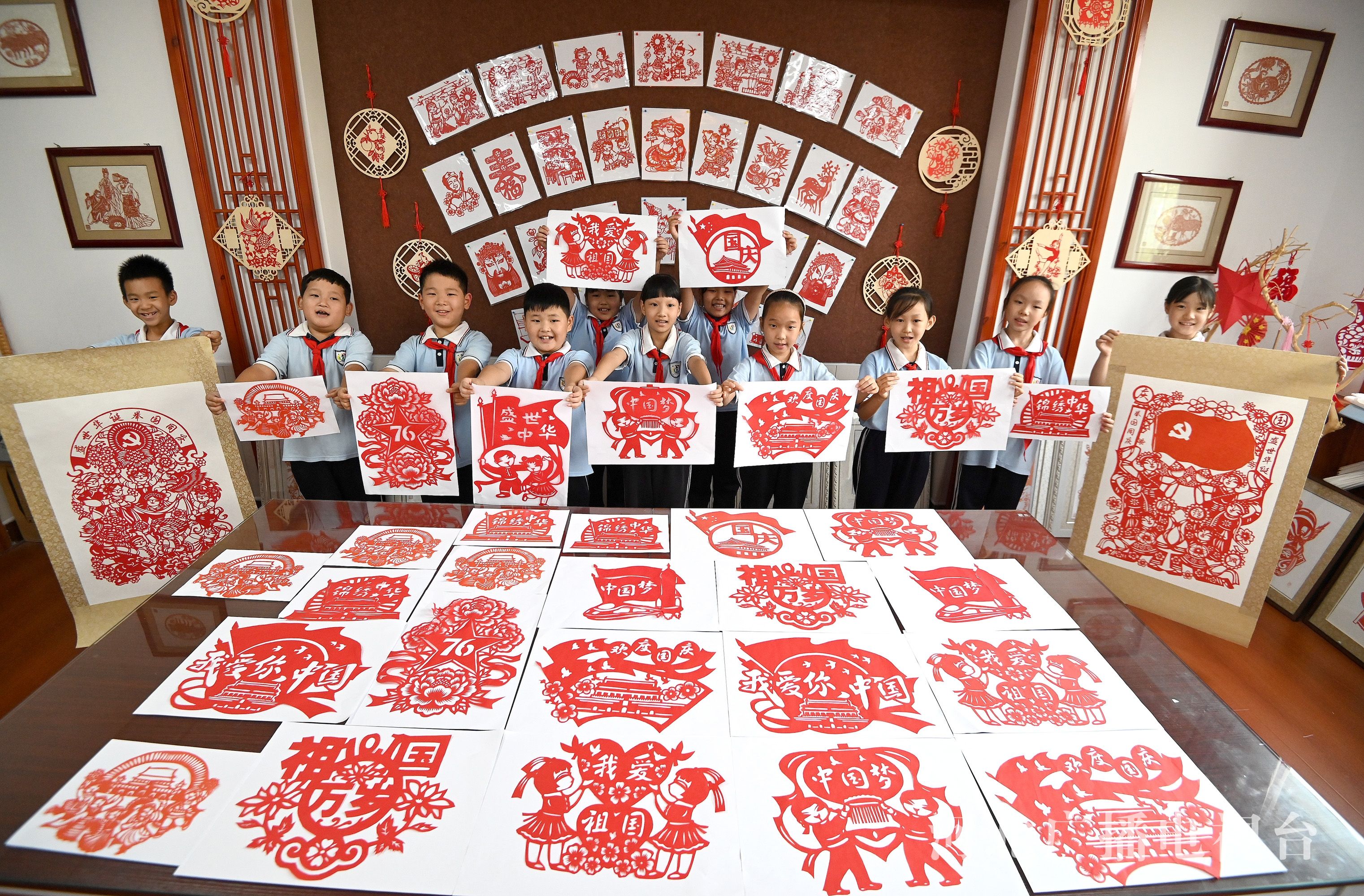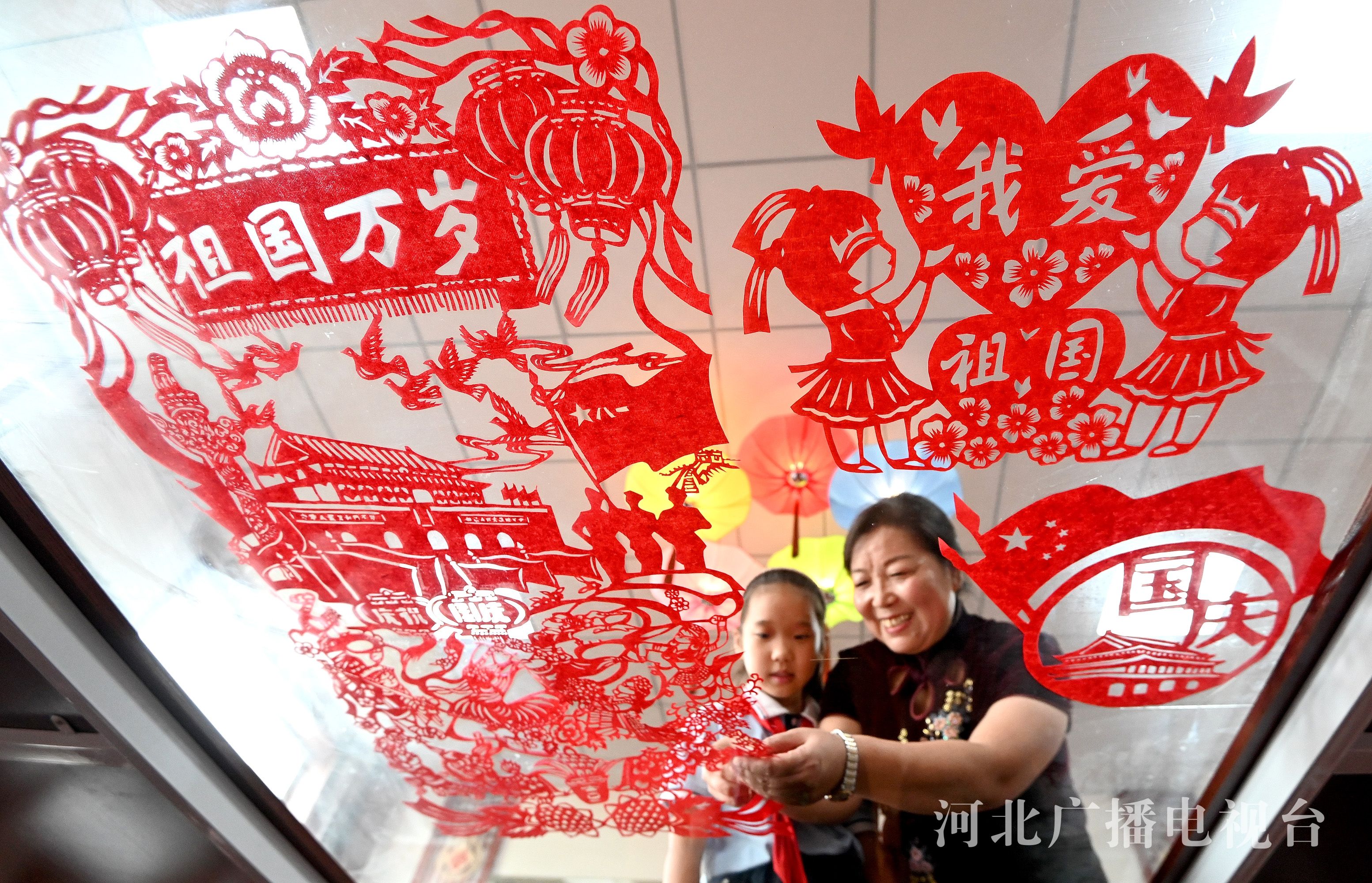 9月28日,河北省邯郸市复兴区铁路小学的学生展示国庆主题剪纸作品。