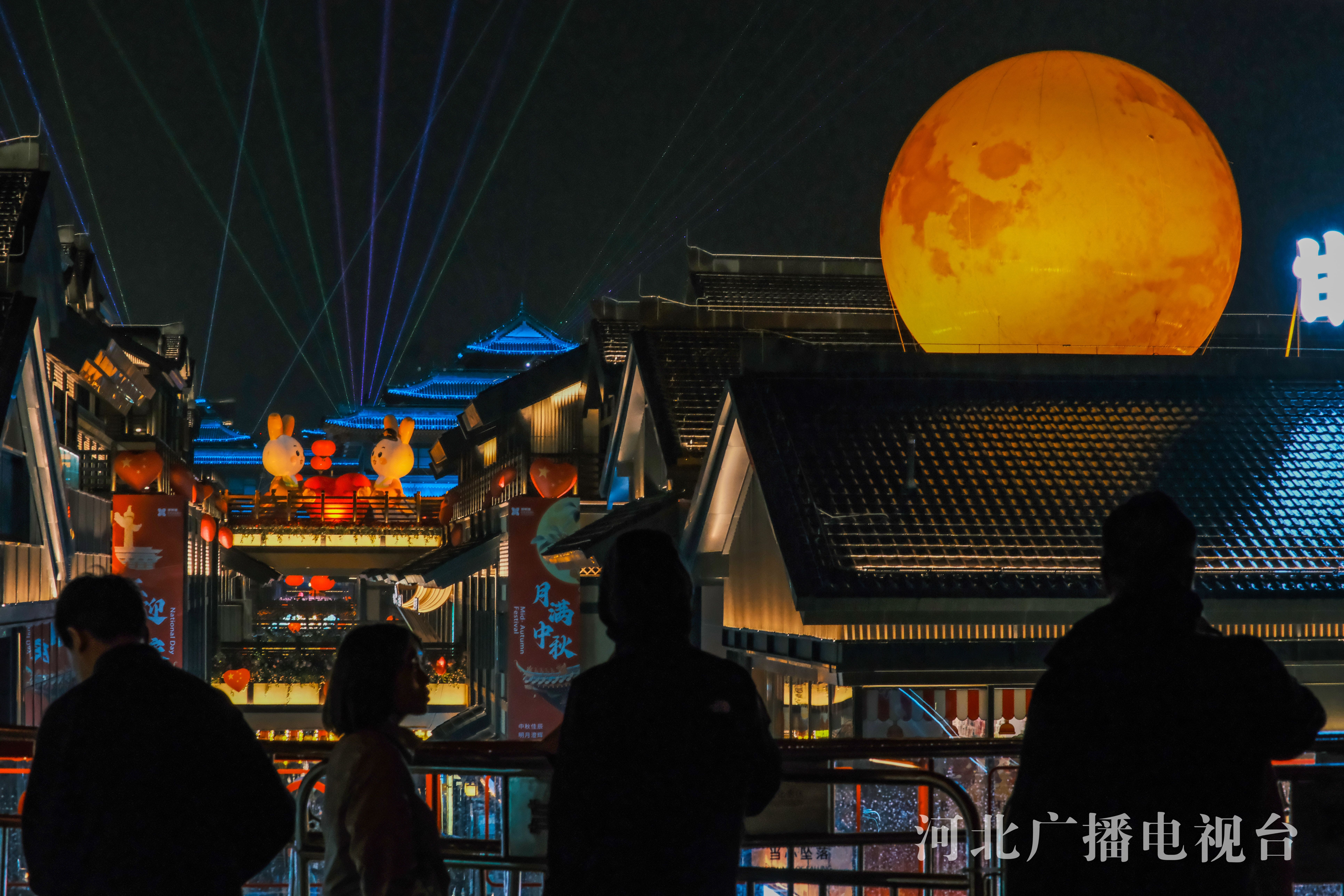 中秋佳节,邯郸道历史文化街区灯火璀璨,人流如织。主街超美月球景观与灯光交相辉映,北区“双兔捧月”装置尽显中秋韵味。古街成为赏月打卡热门地。(拍客 范文平)