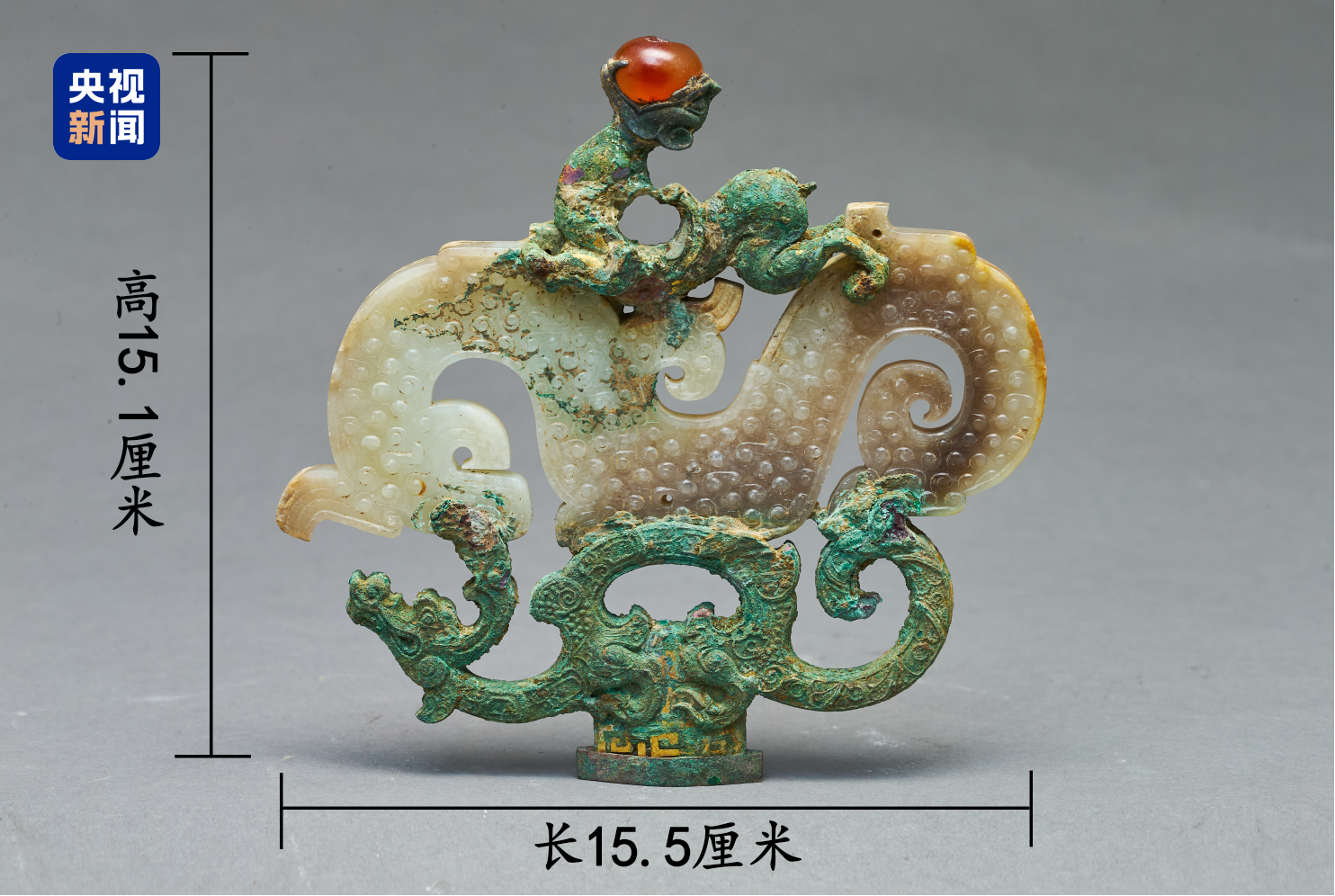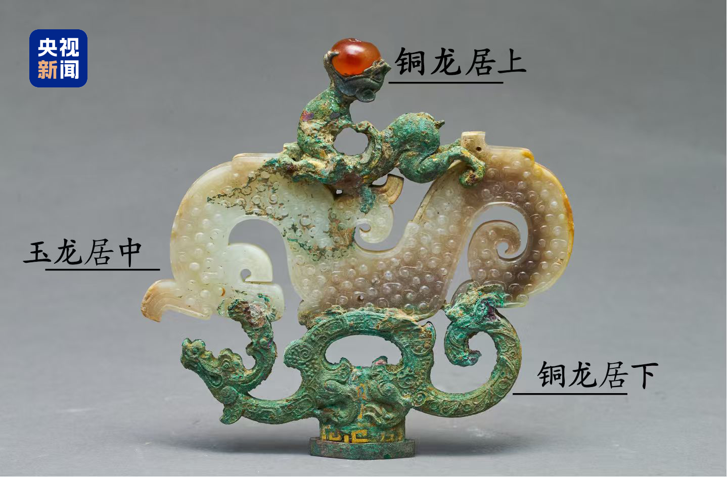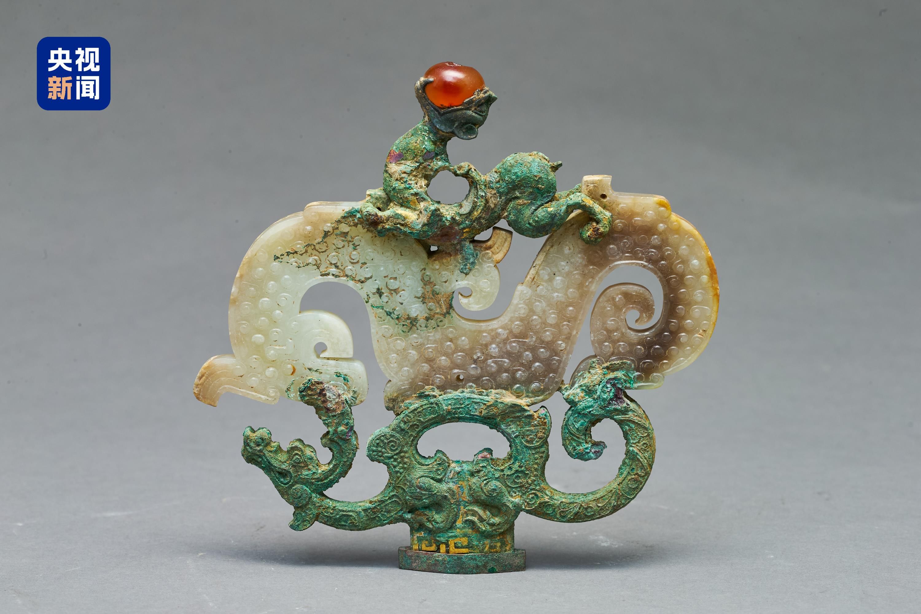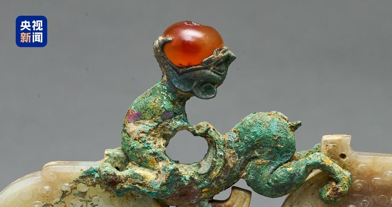 剑柄顶端的铜鎏金嵌玉三龙形饰一亮相