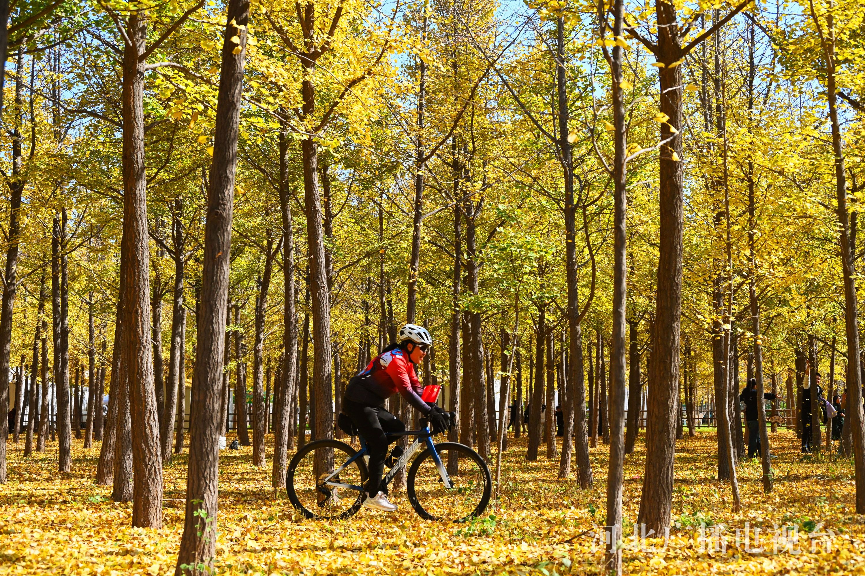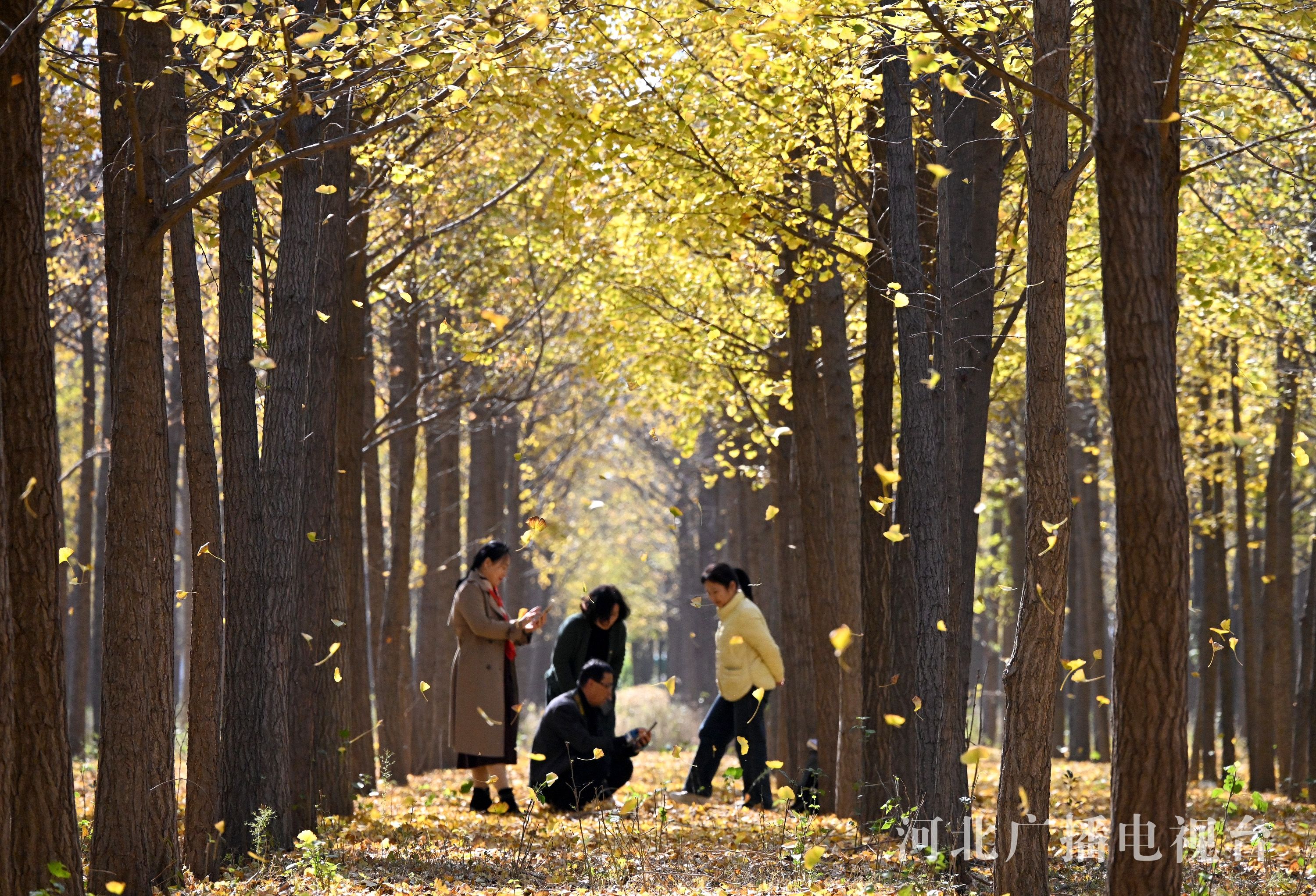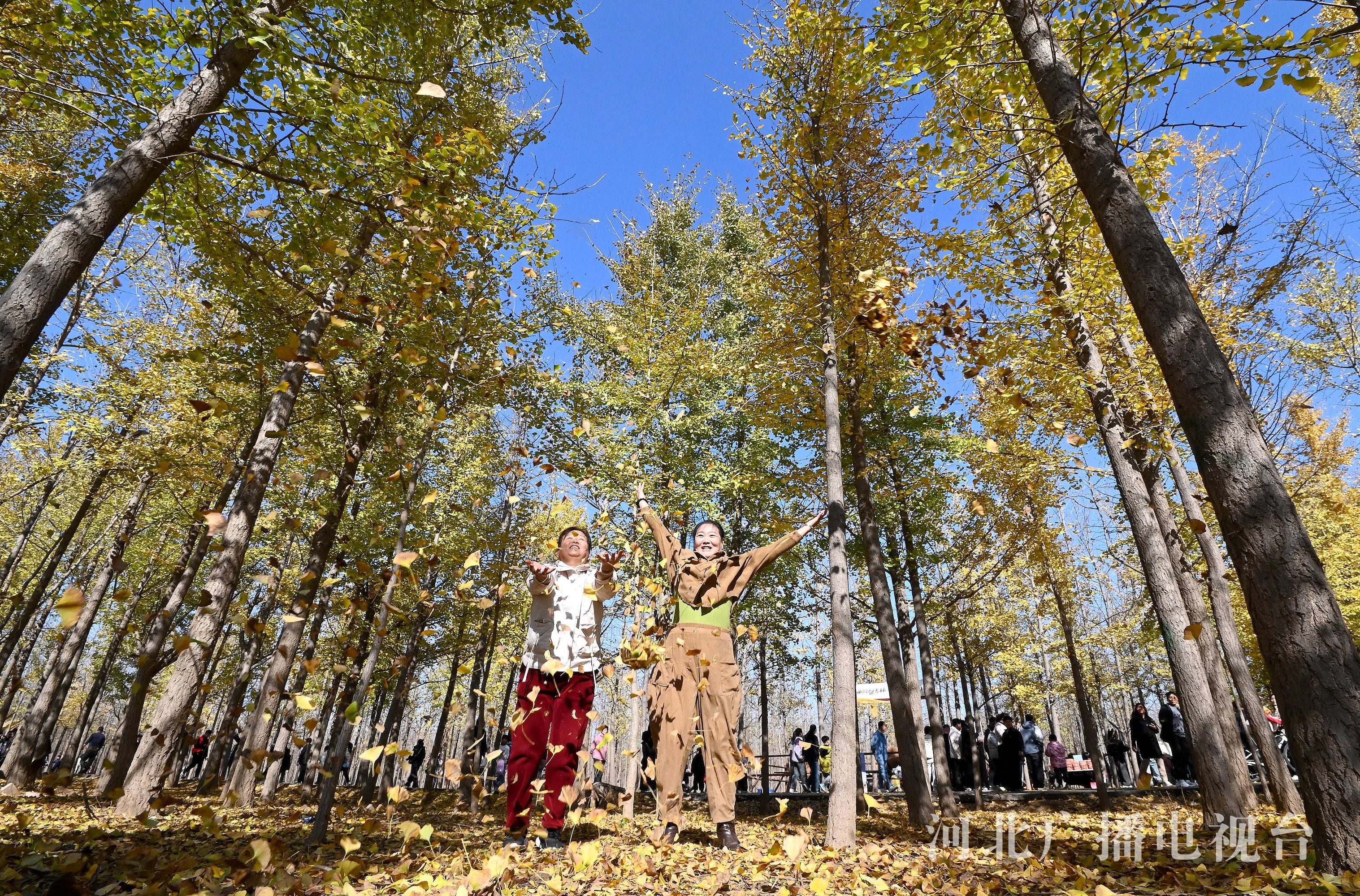 冀时客户端报道(拍客 郝群英) 近日,邯郸市曲周县经济技术开发区的银杏种植基地近千亩银杏林进入最佳观赏期,10万余株银杏树褪去绿装换“金甲”,满树金黄如诗如画,吸引市民和游客驻足观赏、拍照留念。
