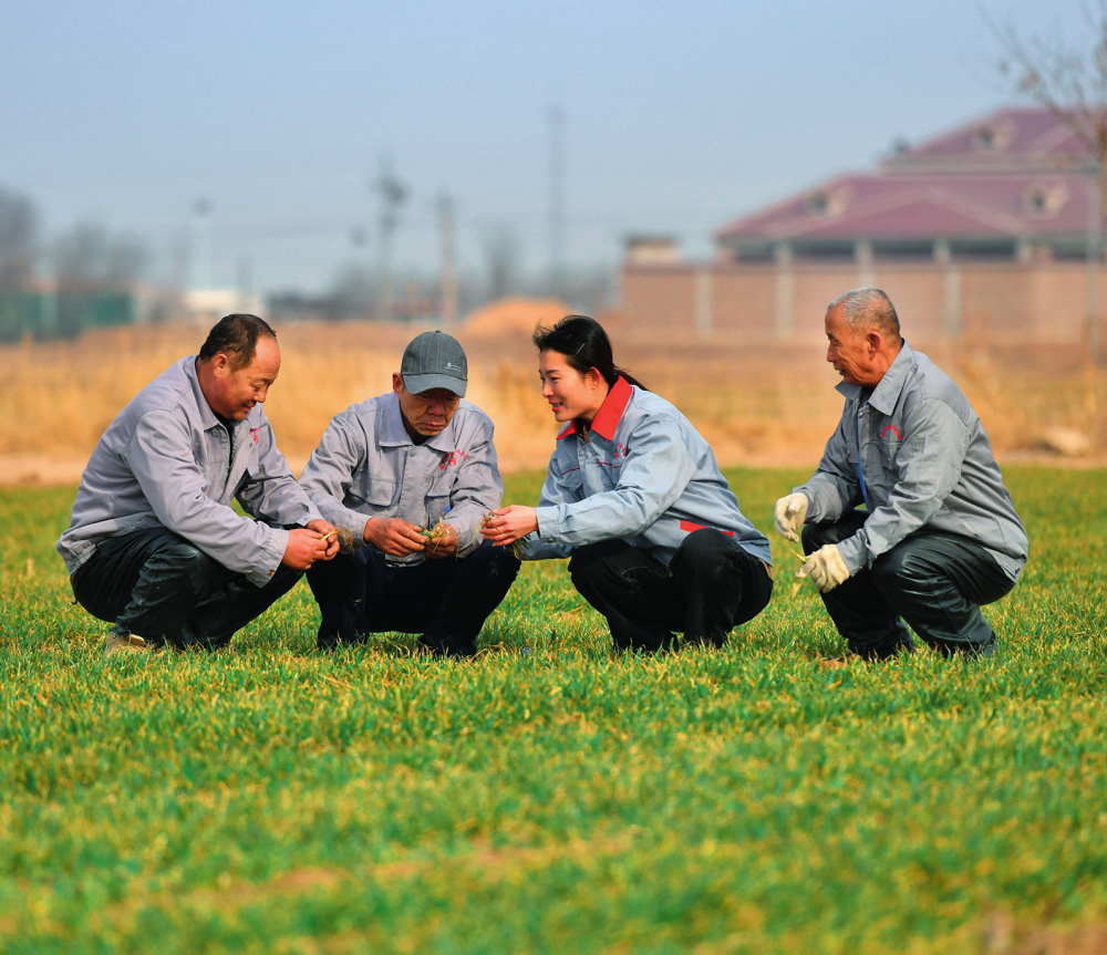 河北省沧州市沧县鑫翰种植专业合作社社员在盐碱地里查看麦苗长势(2025 年 3 月 7 日摄) 牟宇摄 / 本刊