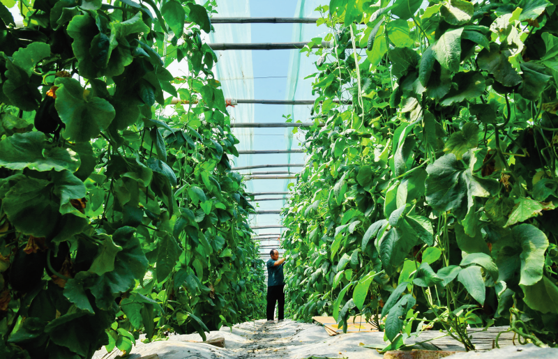 农民在河北省盐山县盐山镇一处盐碱地上建起的果蔬种植棚内劳作(2024 年 6 月 3 日摄) 牟宇摄 / 本刊