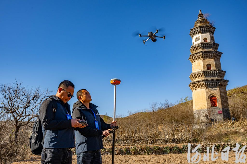文物普查队员操作无人机拍摄南岗塔。河北日报资料片