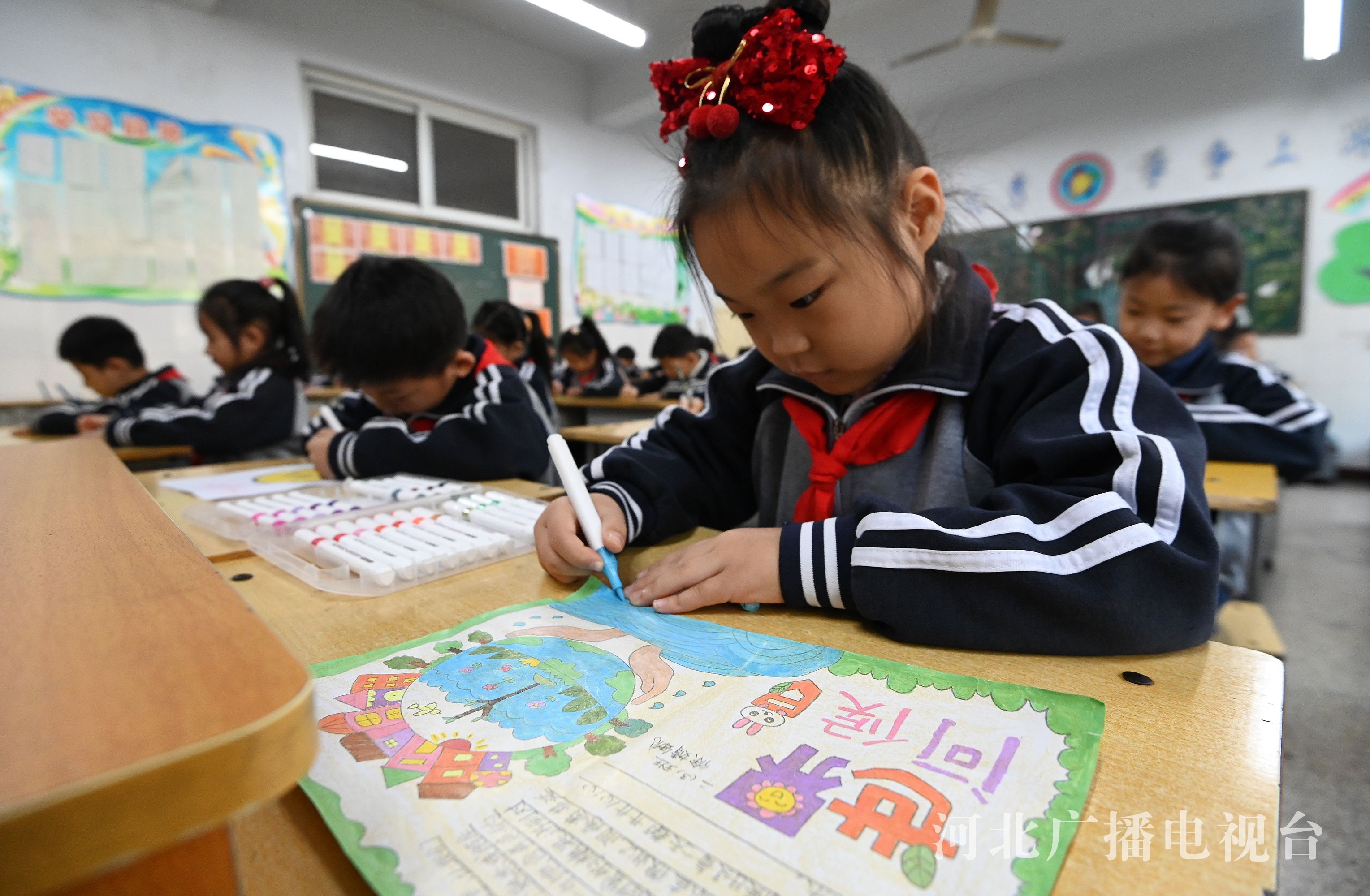 11月20日,河北省邯郸市复兴区铁路小学的学生在创作世界问候日主题手抄报。