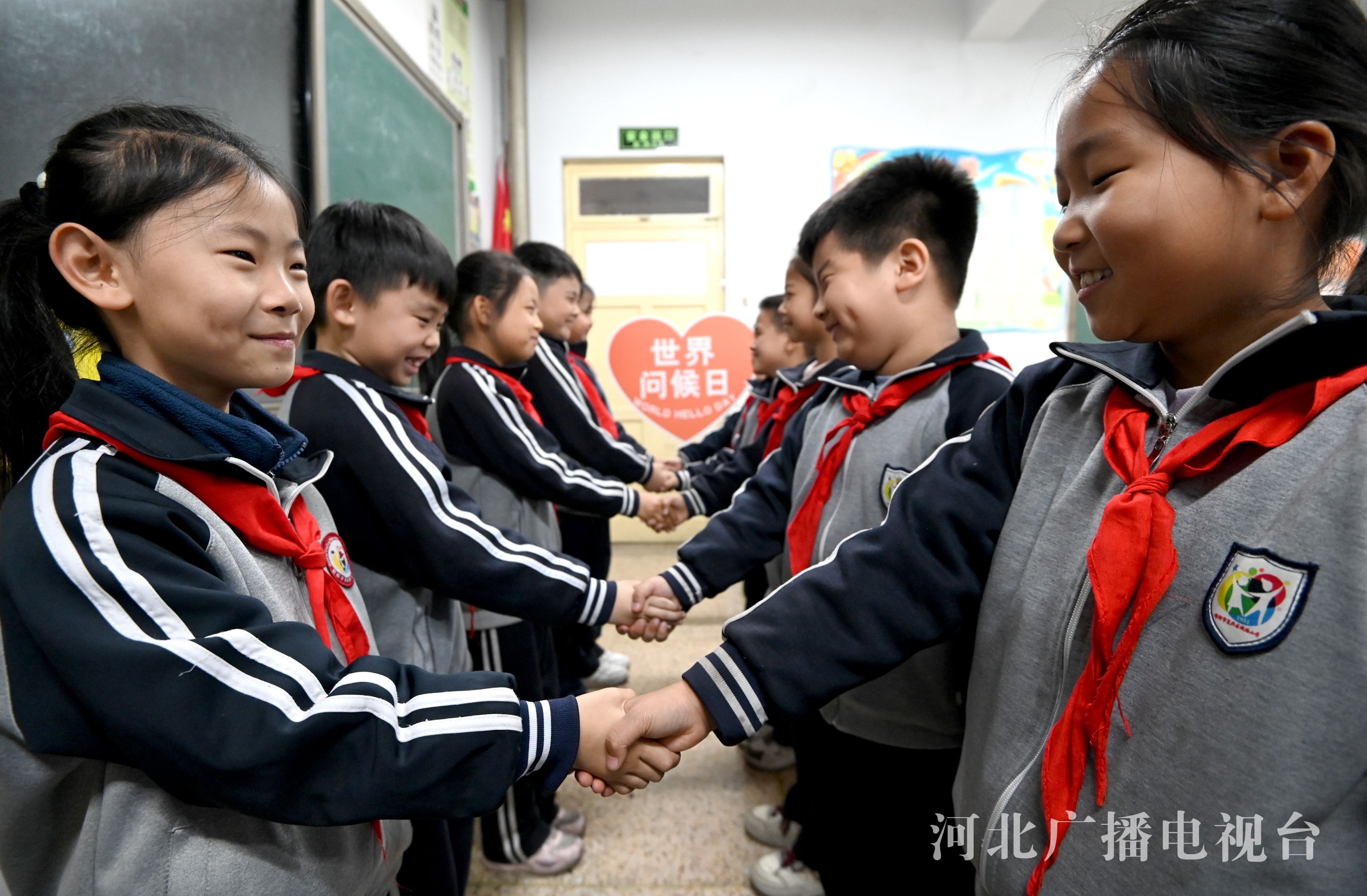 11月20日,河北省邯郸市复兴区铁路小学的学生们互相握手问好。