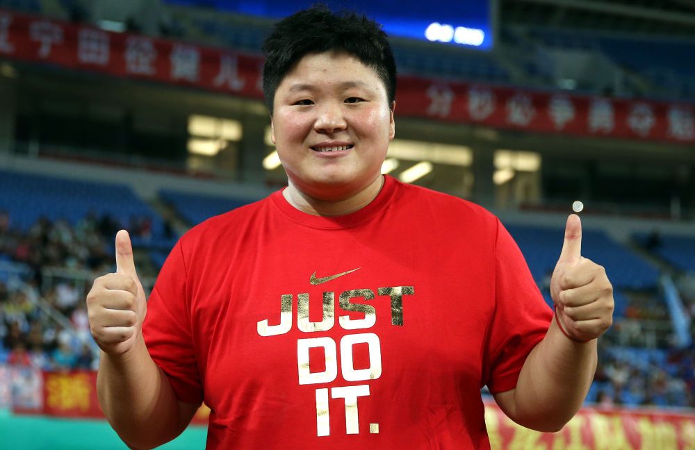2009年10月21日,巩立姣在第十一届全国运动会田径项目女子铅球决赛后庆祝胜利。