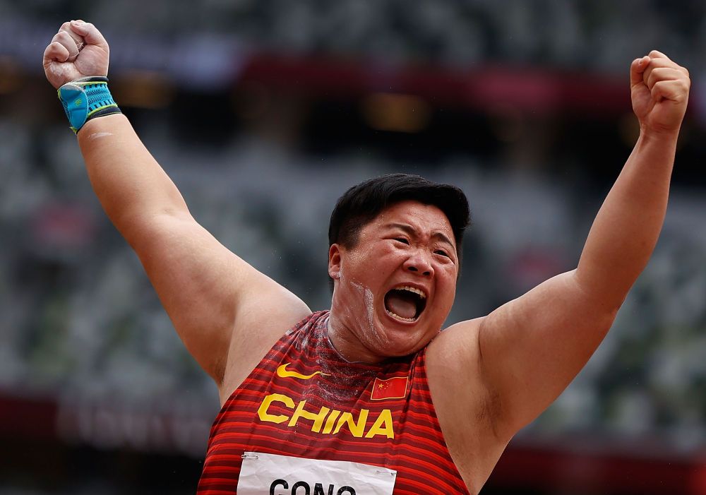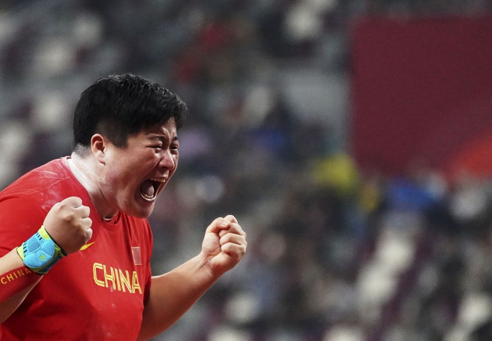 2021年8月1日,巩立姣在东京奥运会田径女子铅球决赛后庆祝胜利。