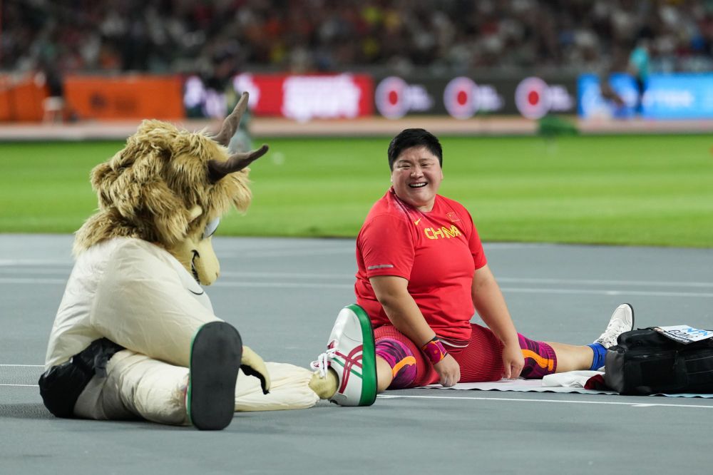 2023年8月26日,巩立姣在世界田径锦标赛女子铅球决赛前与吉祥物一起热身。