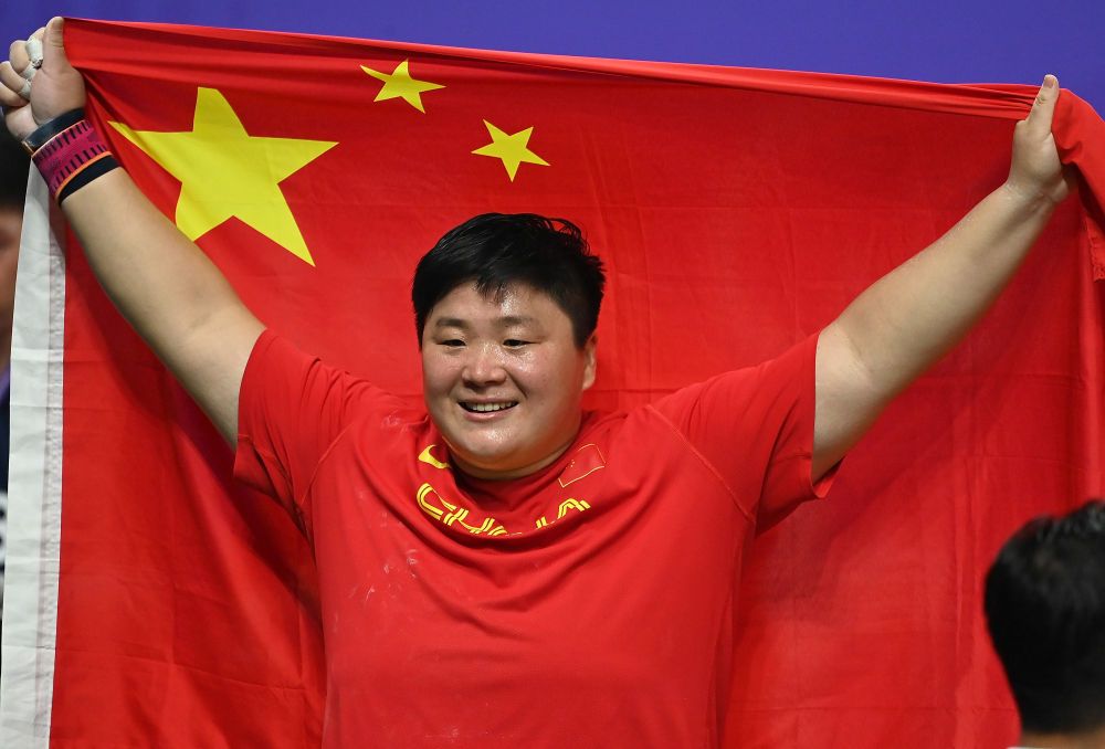 2023年9月29日,巩立姣在杭州亚运会女子铅球决赛后庆祝夺冠。