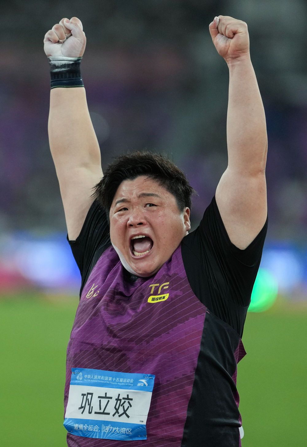 2025年11月16日,河北队选手巩立姣在第十五届全国运动会田径女子铅球决赛中夺冠后庆祝。