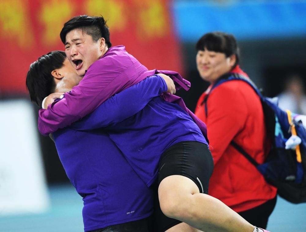 2017年9月6日,巩立姣(中)在第十三届全国运动会田径项目女子铅球决赛后庆祝。
