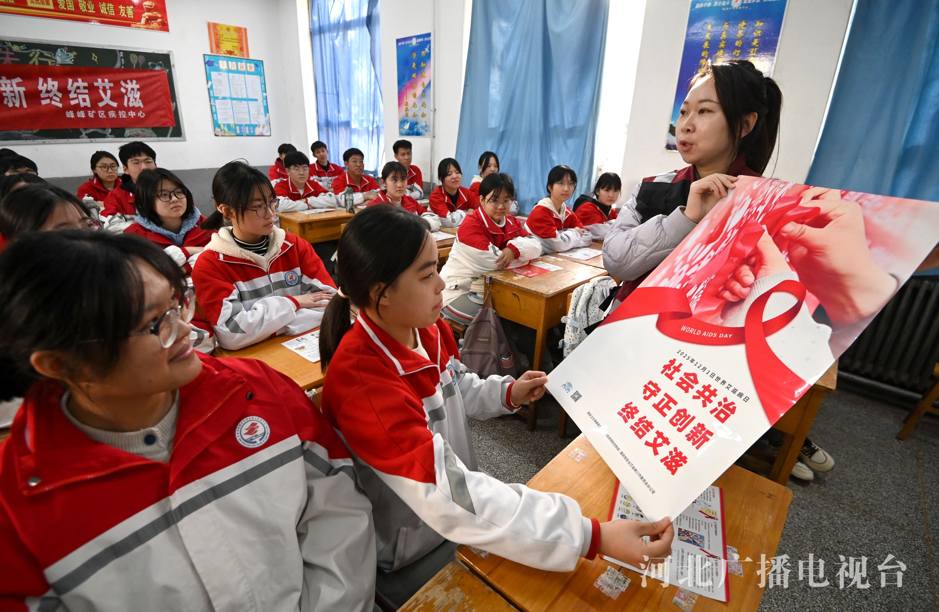 冀时客户端报道(拍客 郝群英)今天(12月1日)是世界艾滋病日,邯郸市峰峰矿区疾病预防控制中心与峰峰矿区职教中心联合举办预防艾滋病宣传教育活动,进一步普及艾滋病防治知识,增强青少年的健康意识和自我保护能力。