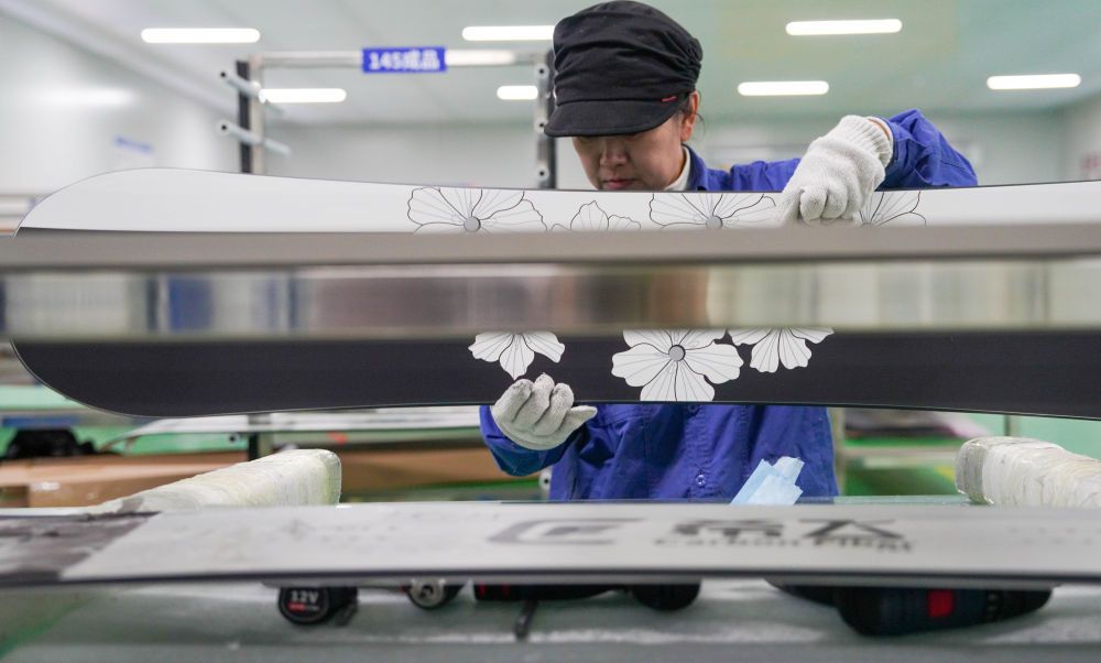 12月4日,在吉林化纤国兴复合材料有限公司车间内,工作人员复检公司自主研发生产的碳纤维滑雪板。新华社记者 颜麟蕴 摄