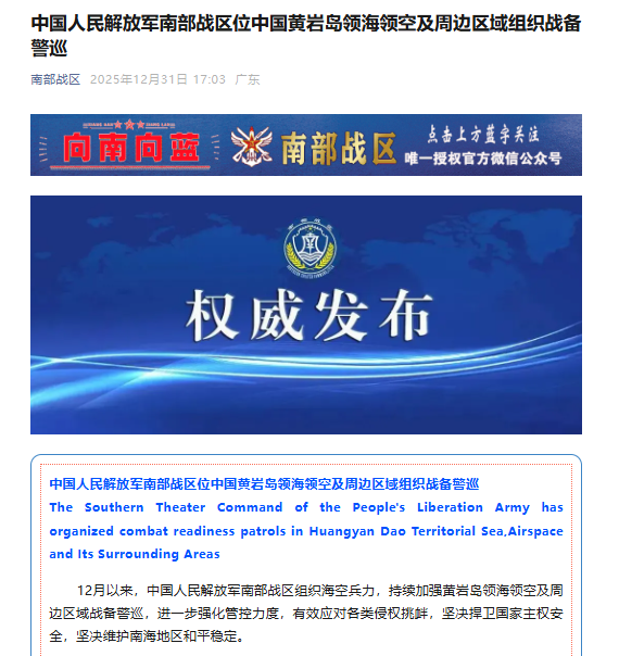 12月以来,中国人民解放军南部战区组织海空兵力,持续加强黄岩岛领海领空及周边区域战备警巡,进一步强化管控力度,有效应对各类侵权挑衅,坚决捍卫国家主权安全,坚决维护南海地区和平稳定。