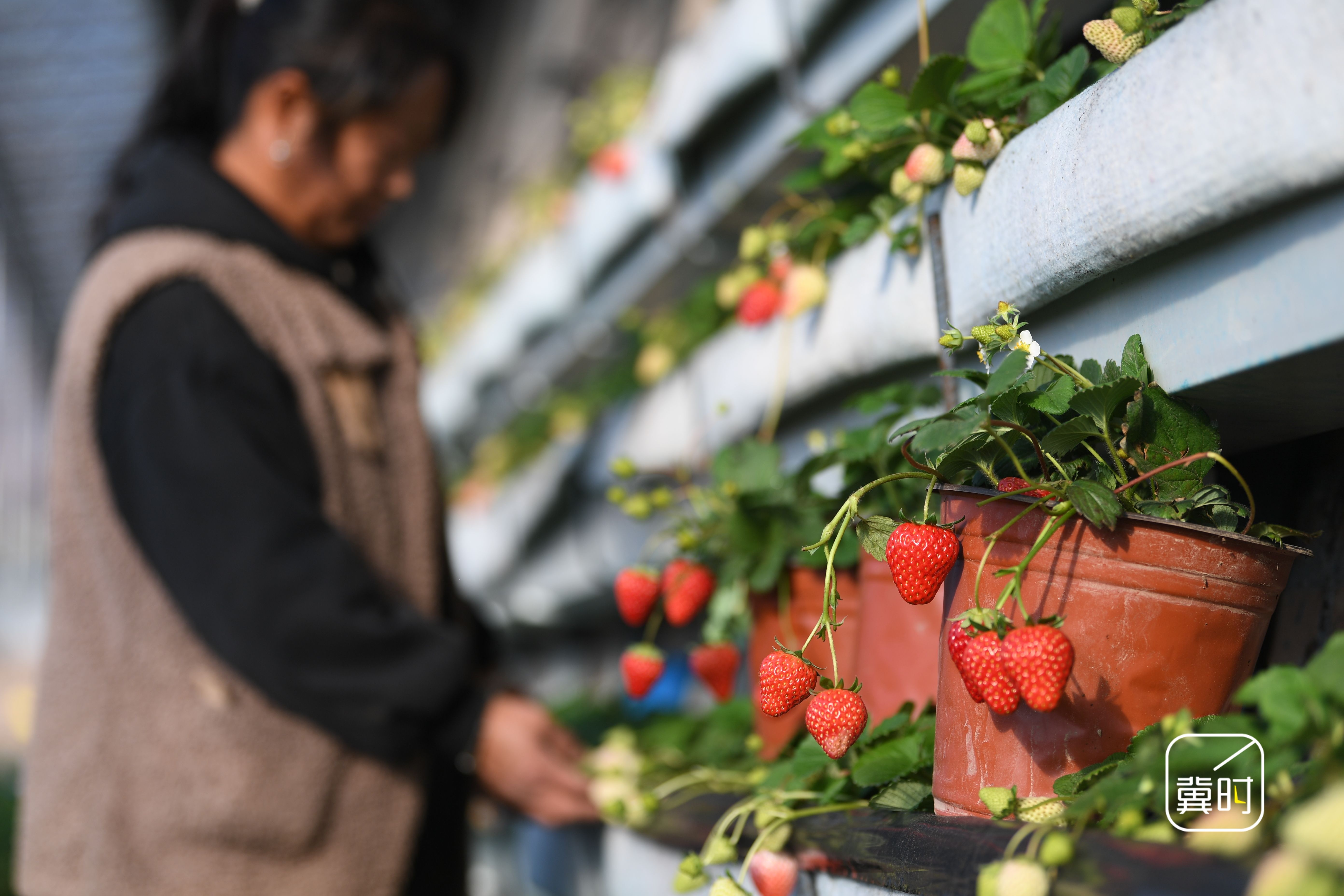 2026年1月7日,在河北省邯郸市广平县南阳堡镇草莓种植基地,农户在管护盆栽草莓。