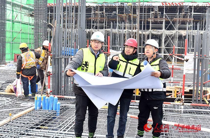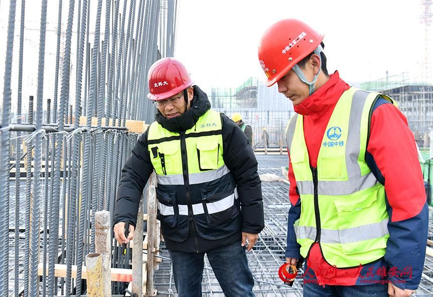 苏复在北科大雄安校区建设现场,与施工单位核对细节。人民网记者 宋烨文摄