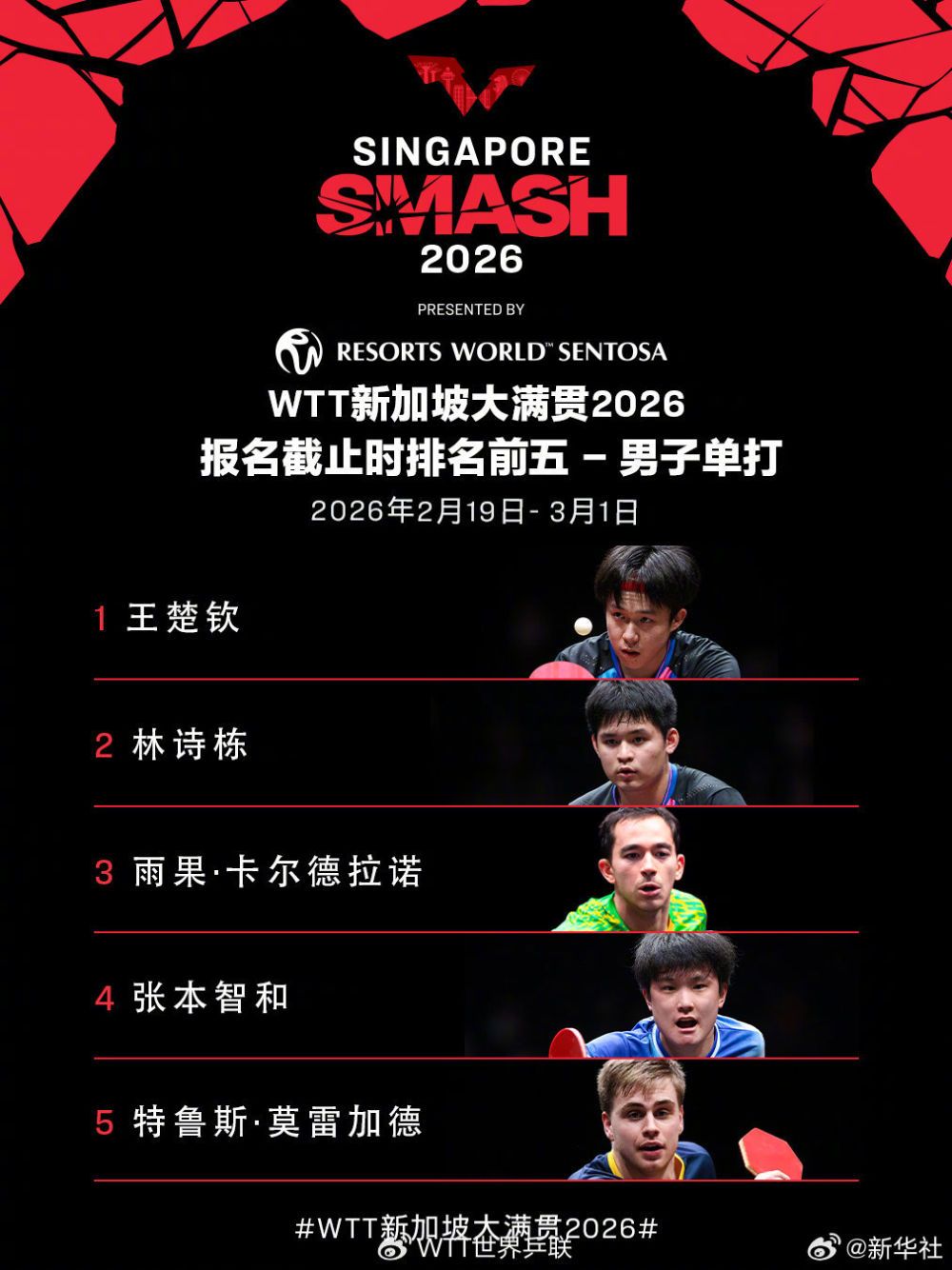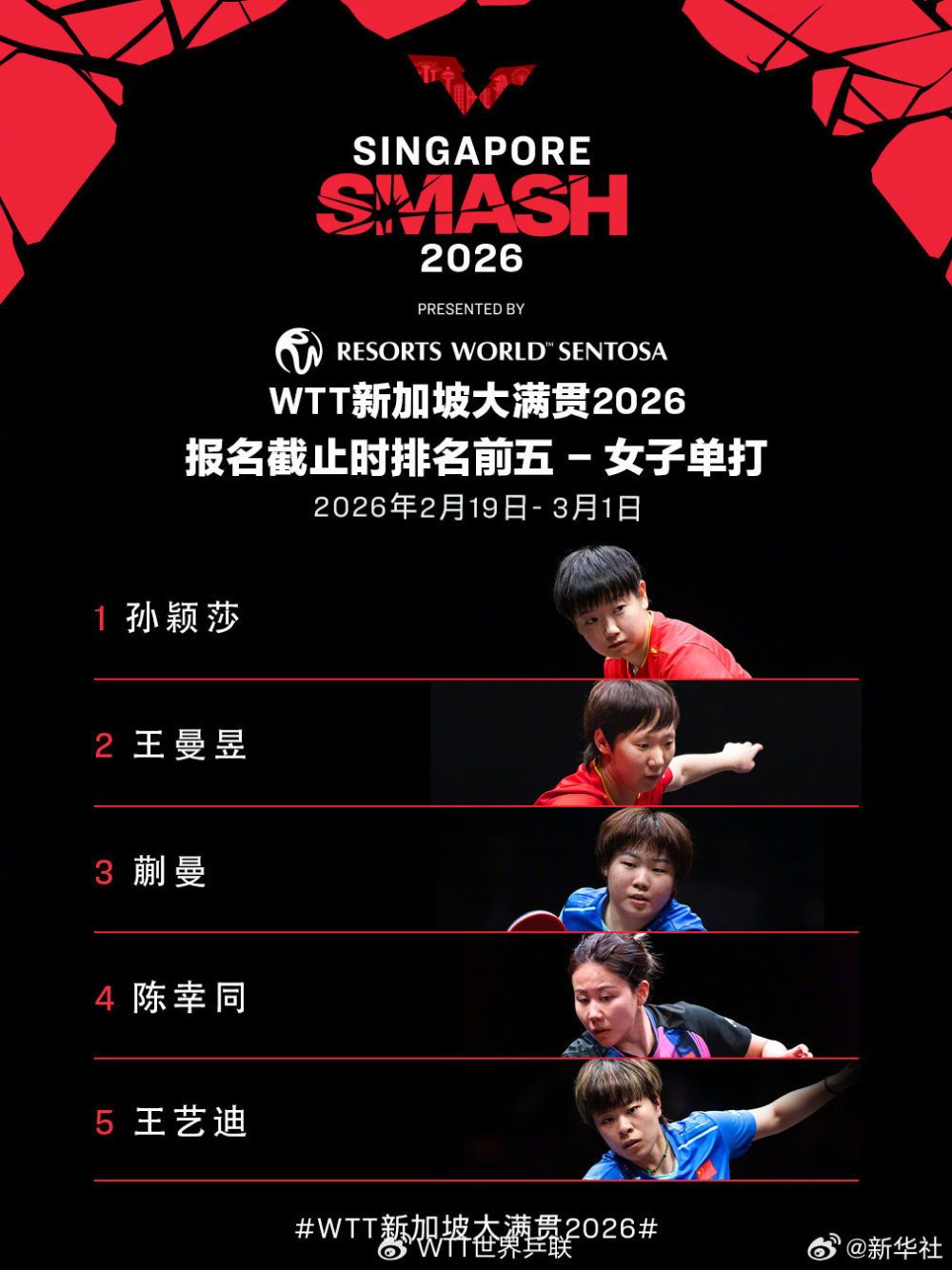 WTT新加坡大满贯2026将于2月19日至3月1日在新加坡体育中心举行。WTT世界乒联公布首批参赛名单。一起期待!